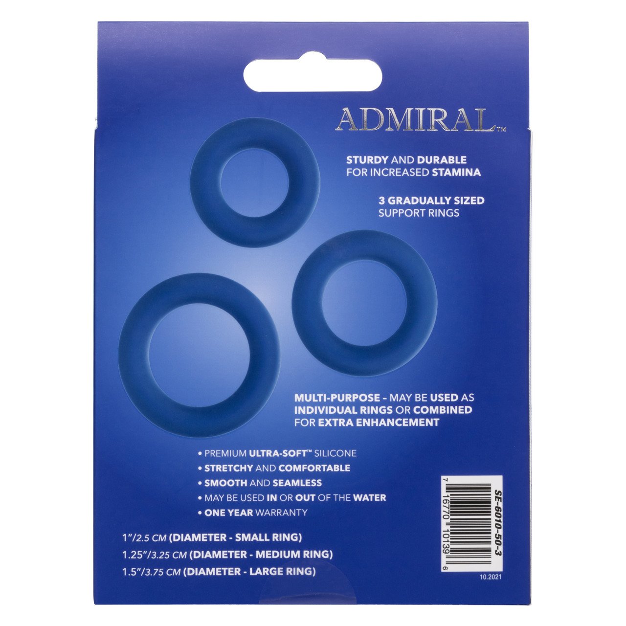 Uncharted territories of pleasure await you with the adventurous Admiral Universal Cock Ring Set. A set of 3 gradually sized liquid Silicone enhancers wrap you up in a thrilling embrace to boost performance. Each cock ring in this gradually increased in size with a tight, supple feel for a sensational experience with every wear.