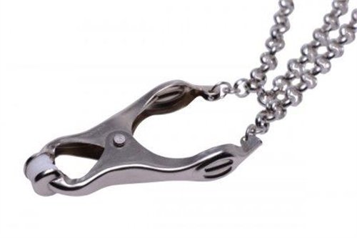 Please your partner with the stunning aesthetic of these unique nipple clamps. The extreme grip tip keeps them firmly on your lovers nipples, pinching for the perfect combination of pleasure and pain. Easy to use, these clamps can be utilized quickly and efficiently in the heat of the moment, or more ritualistically during your play scene. Attach weights to the chains for additional sensation play to send your masochist over the edge. This beautiful set of clamps is not only stunning to look at, but will provide the stimulation that your partner craves.