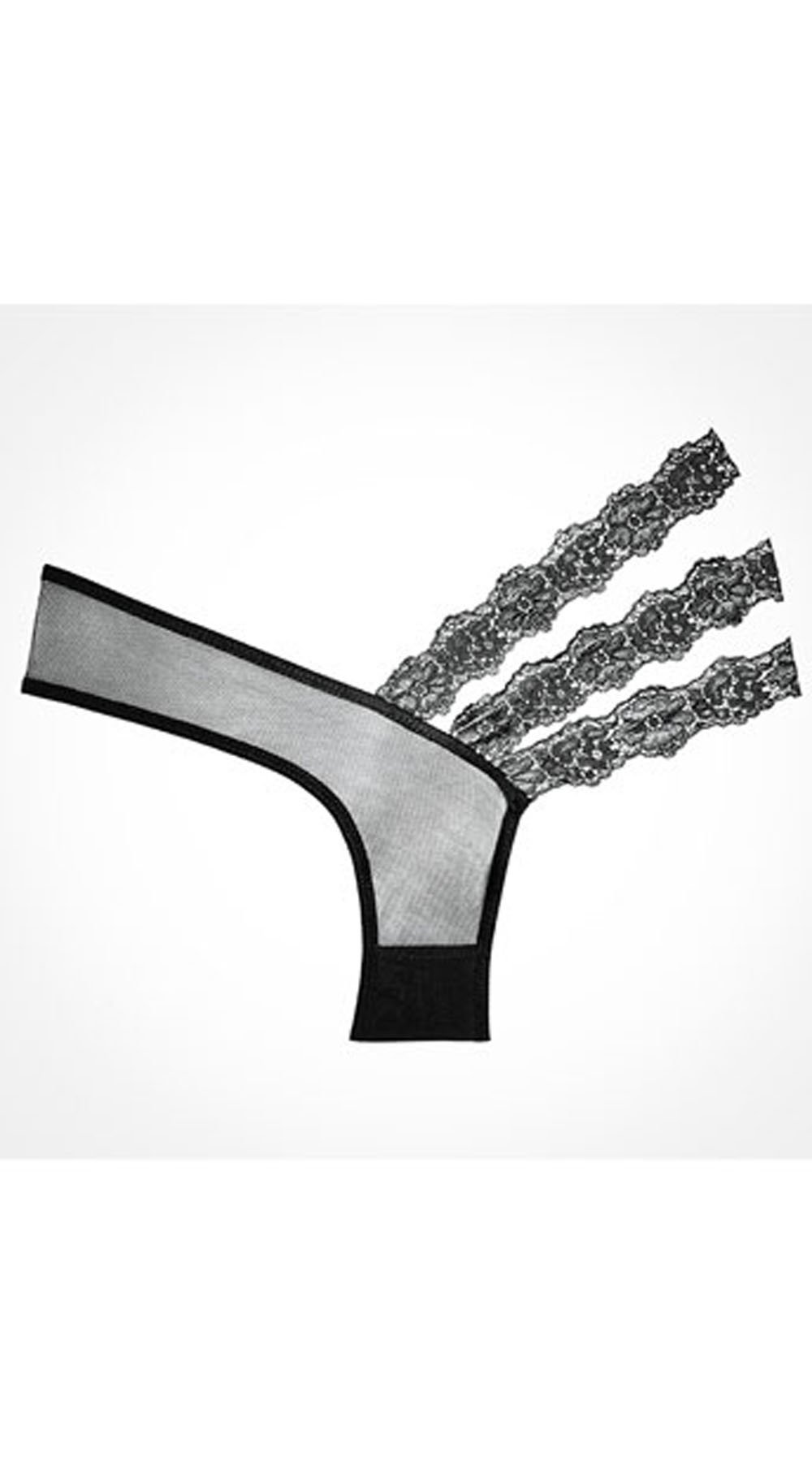 Asymmetrical sheer panty with blossoming triple lace side bands.