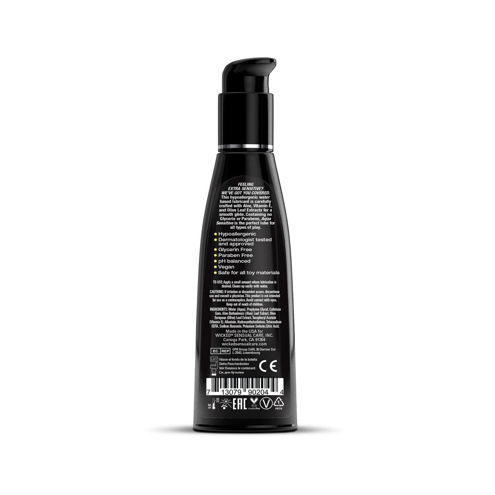 Indulge yourself and your most delicate areas with this incredibly smooth and satiny, hypoallergenic lubricant. The luxurious Glycerin and Paraben- free formula is specifically crafted for sensitive skin to heighten sensation and arouse satisfaction. Enhanced with skin nurturing Aloe and Olive leaf extracts as well as Vitamin E, Wicked Aqua Sensitive will caress your body and provide new levels of pleasure.