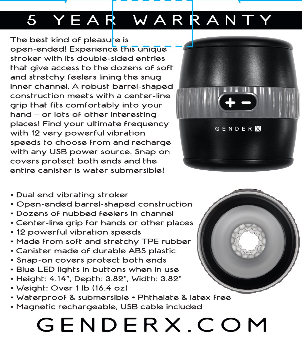 The best kind of pleasure is open-ended! Experience this unique stroker with its double-sided entries that give access to the dozens of soft and stretchy feelers lining the snug inner channel. A robust barrel-shaped construction meets with a center-line grip that fits comfortably into your hand – or lots of other interesting places! Find your ultimate frequency with 12 very powerful vibration speeds to choose from and recharge with any USB power source. Snap on covers protect both ends and the entire canister is water submersible!