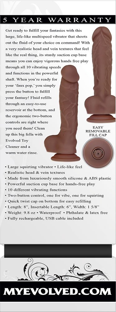 Get ready to fulfill your fantasies with this large, life-like multispeed vibrator that shoots out the fluid of your choice on command! With a very realistic head and vein textures that feel like the real thing, its sturdy suction cup base means you can ennoy vigorous hands free play through all 10 vibrating speeds and functions in the powerful shaft. When you’re ready for your ‘faux pop,’ you simply press the button to fulfill your fantasy! Fluid refills through an easy-to-use resevoir at the bottom, and the ergonomic two-button controls are right where you need them!