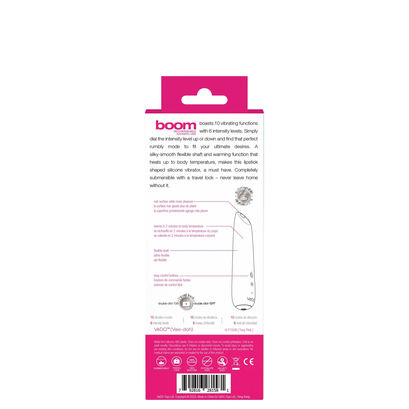 BOOM ultra-powerful vibrator boasts 10 vibrating functions with 6 intensity levels. Simply dial the intensity level up or down and find that perfect rumbly mode to fit your ultimate desires. A silky-smooth flexible shaft and warming function that heats up to body temperature, makes this lipstick shaped silicone vibrator, a must have. Completely submersible with a travel lock never leave home without it.