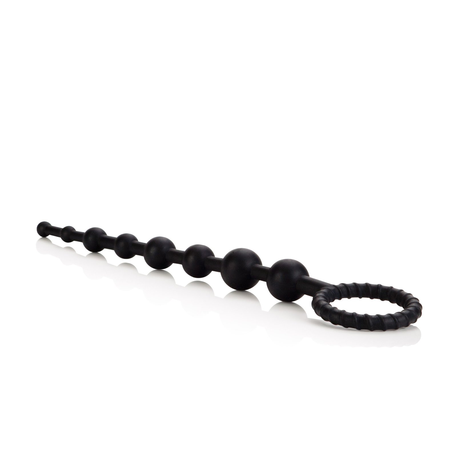Graduated durable firm and flexible Silicone pleasure beads. Sturdy retrieval ring.