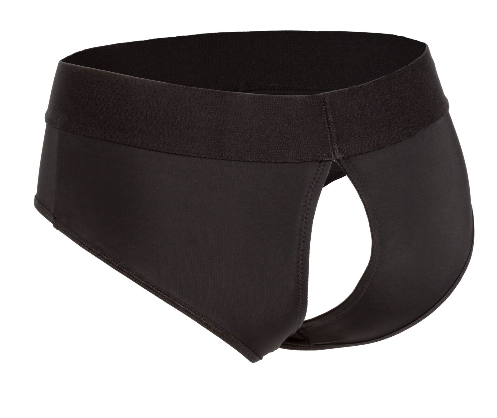 The Boundless Backless Brief is an ultra-comfortable harness fashioned like a a risqu backless brief with powerful performance and comfort in mind. This bold harness has an extra-wide waistband, soft stretchy fabric and reinforced O ring for the ultimate support. The durable, reinforced O-ring stretches to accommodate your favorite packer, vibrator or dildo. With a form-fitting design, this comfort harness can be worn discreetly under clothes. Enjoy pleasure made for two with the double panel interior for easy access to your favorite probe.