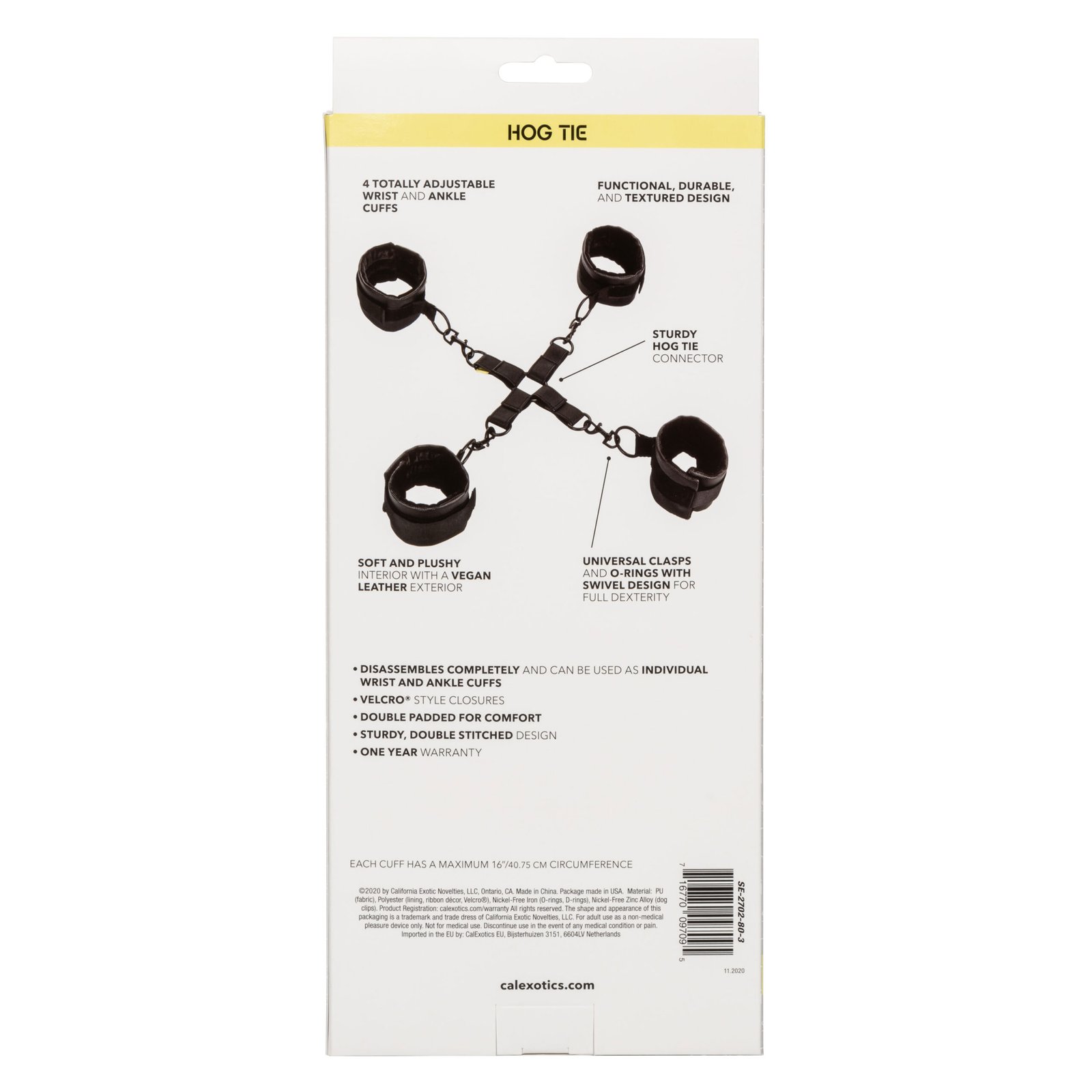 With 2 fully adjustable ankle cuffs and 2 fully adjustable handcuffs bound with Velcro-style hook-and-loop fasteners, this hog-tie also comes with universal clasps and o-rings with a swivel design for full dexterity and maximum comfort, while being totally bound.