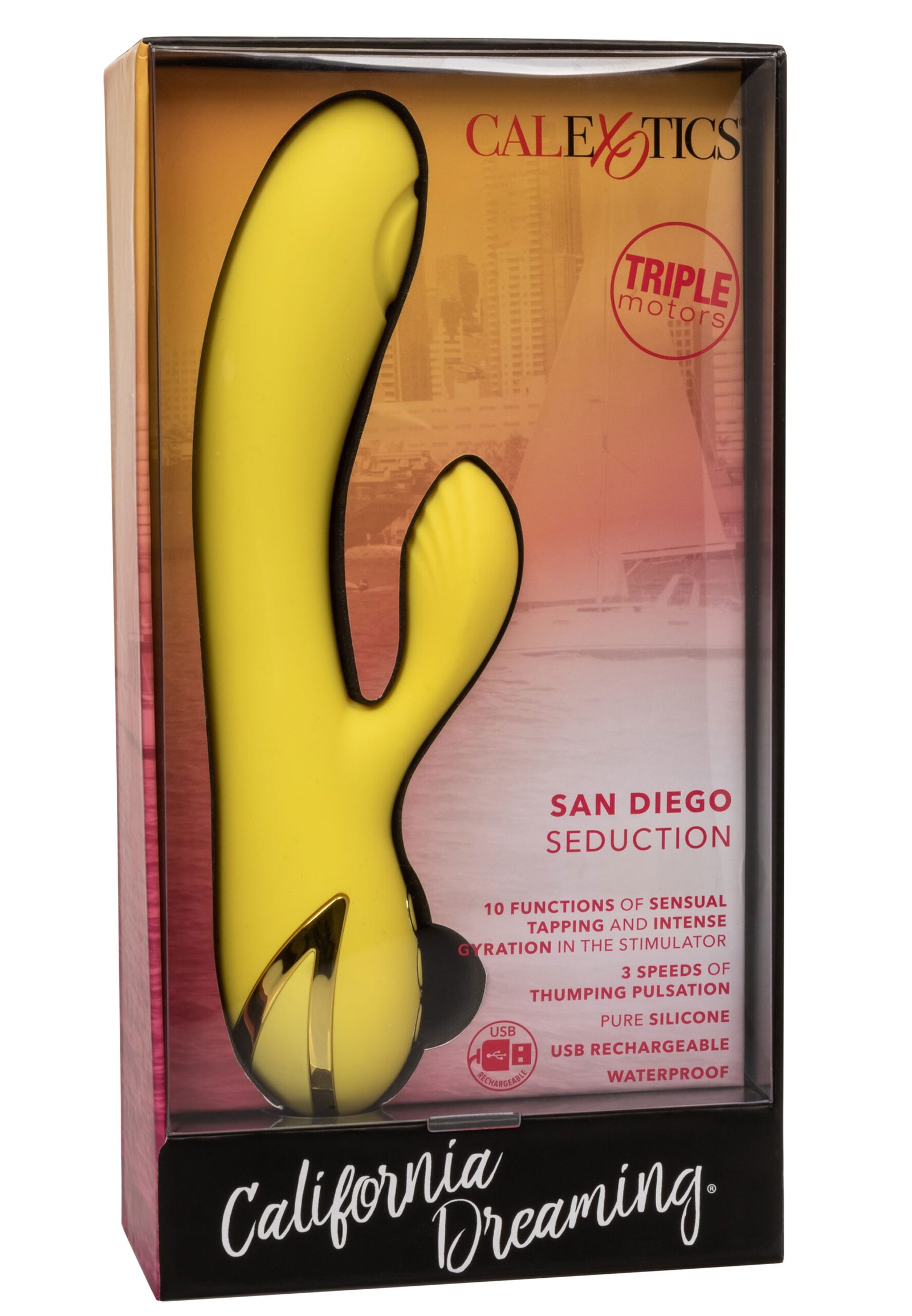 Dive deep into a sea of pleasure and sun-kissed fantasies with the playful California Dreaming San Diego Seduction. The powerful rabbit massager has 10 intense tapping and gyrations functions and 3 shaft thumping speeds for one-of-a-kind pleasure experience. The seamless silicone body and textured teaser put out knee-shaking stimulation in and out of the water. The knee-shaking gyrations packed into this playful vibe aren’t for the faint of heart! Triple power motors put out deep rumbling vibrations, teasing taps, and vigorous thumping. Whether you’re looking to turn up the heat with a lover or just enjoy some sensual solo time, this ravishing massager is ready. While the curved shaft indulges you in powerful g-spot stimulation, the tapping clitoral teaser delivers blissful external pleasure. Control and customize your pleasure play with the independently controlled vibration and rotating functions. Recharge the massager in 2.5 hours with the provided USB charging cable to enjoy 35 minutes of high-speed stimulation or 90 minutes of low speed vibrations. Enjoy frustration-free control with the easy-touch 3 -button control pad and security lock feature for travel-ready teasing. The virtually seamless body and self-sealing charging port allow you to get this versatile waterproof vibe for a dip. The hypoallergenic premium silicone is body safe, unscented and phthalate free to keep your most sensitive spots, happy and healthy.
