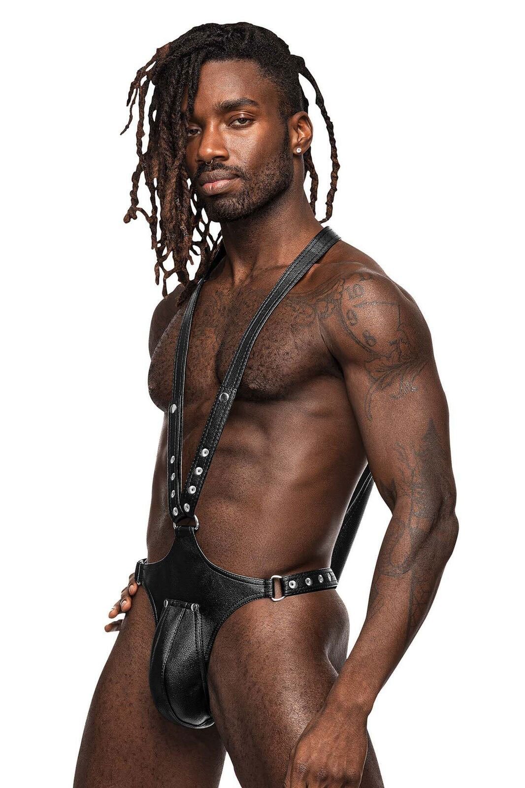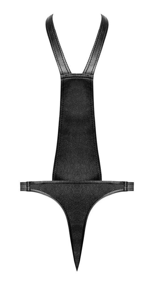 From the Leather Collection by Male Power, this style includes a full body sling with a thong back, adjustable “V” shoulder straps, adjustable hip straps and an easy access snap pouch, metal snaps and rings.