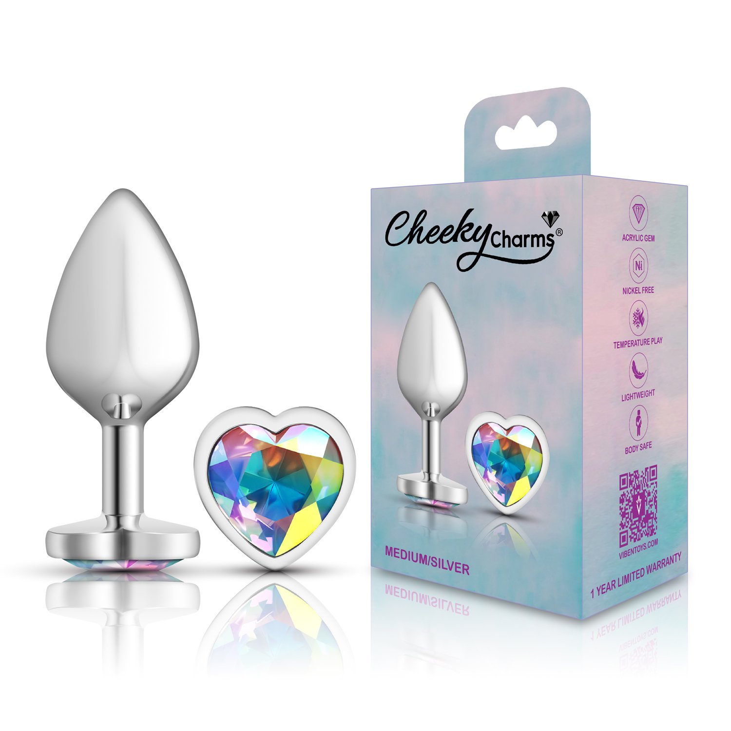 Medium, silver metal, teardrop shaped anal plug with sparkling clear iridescent colored, heart shaped acrylic gemstone. Hypoallergenic, nonporous, body safe, nickel free, aluminum alloy, anal jewelry compatible with all lubricants. Easy to clean and dishwasher safe butt plugs.