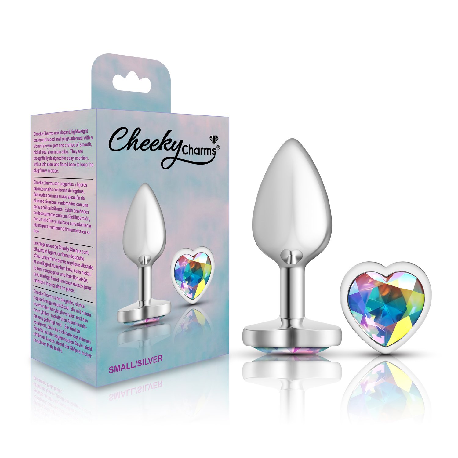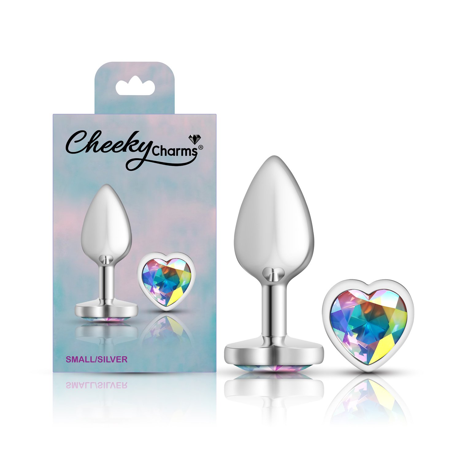 Small, silver metal, teardrop shaped anal plug with sparkling clear iridescent colored, heart shaped acrylic gemstone. Hypoallergenic, nonporous, body safe, nickel free, aluminum alloy, anal jewelry compatible with all lubricants. Easy to clean and dishwasher safe butt plugs.
