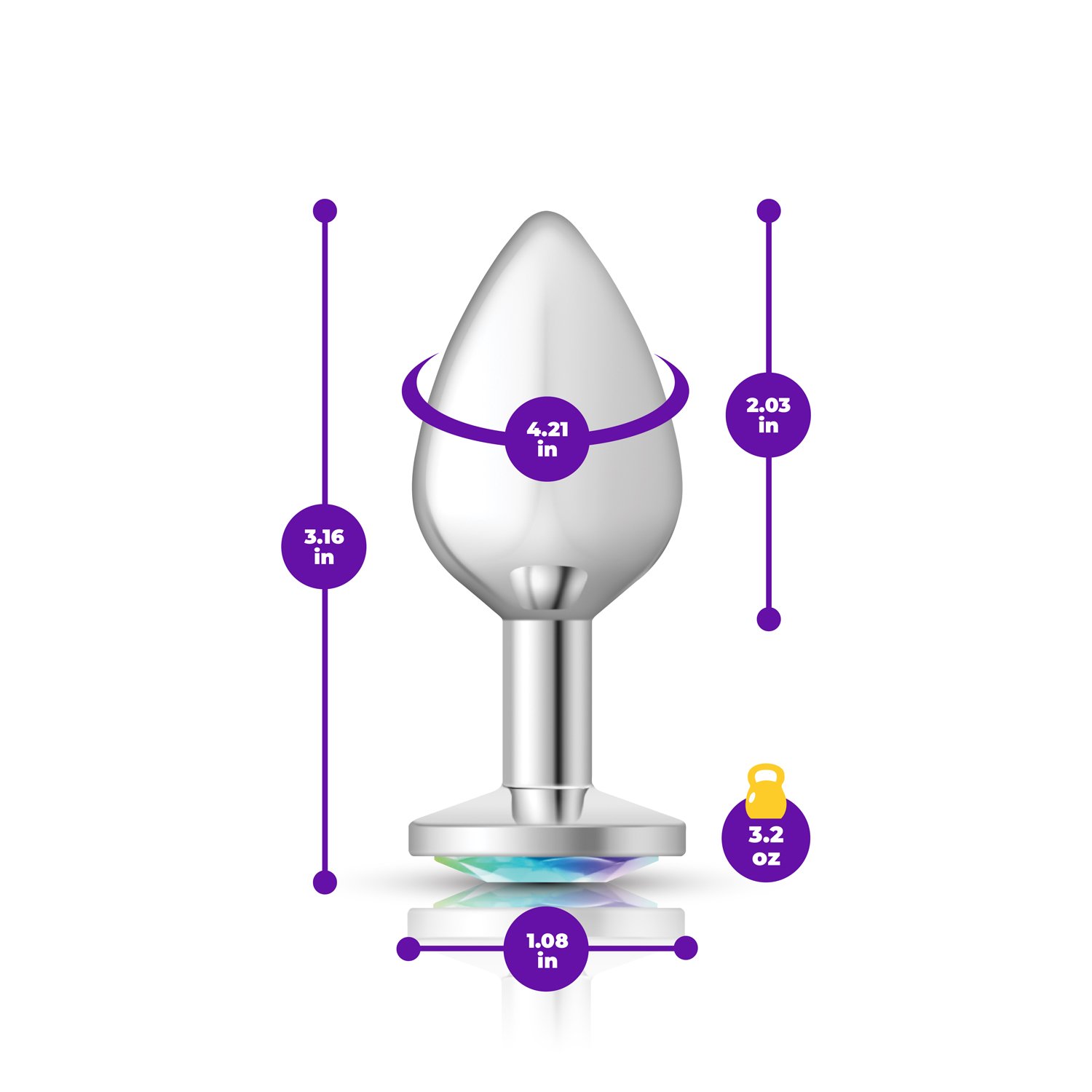 Measurements: Overall length: 3.16″ (8.03 cm), insertable length: 2.03″ (5.16 cm), circumference: 4.21″ (10.69 cm)