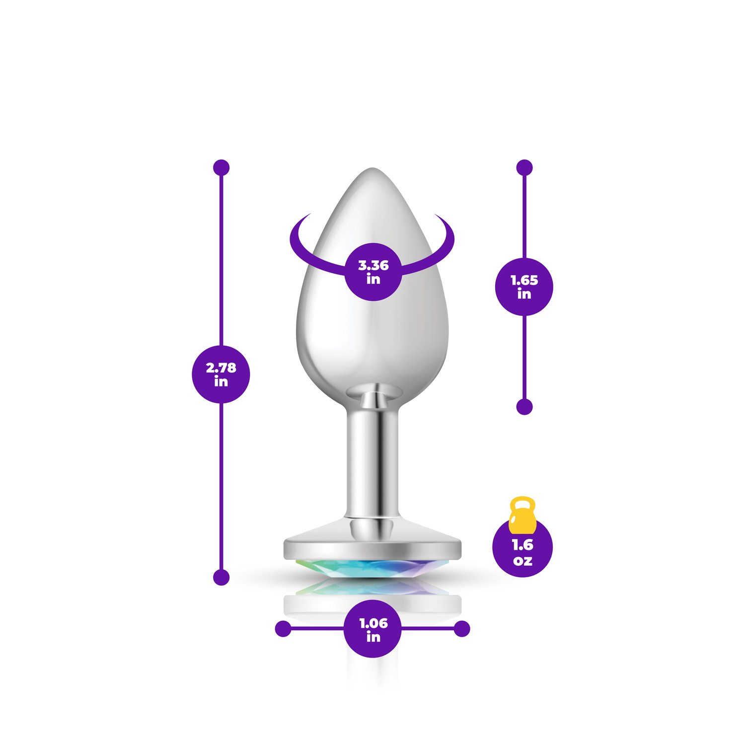 Measurements: Overall length: 2.78″ (7.06 cm), insertable length: 1.65″ (4.19 cm), circumference: 3.36″ (8.53 cm)
