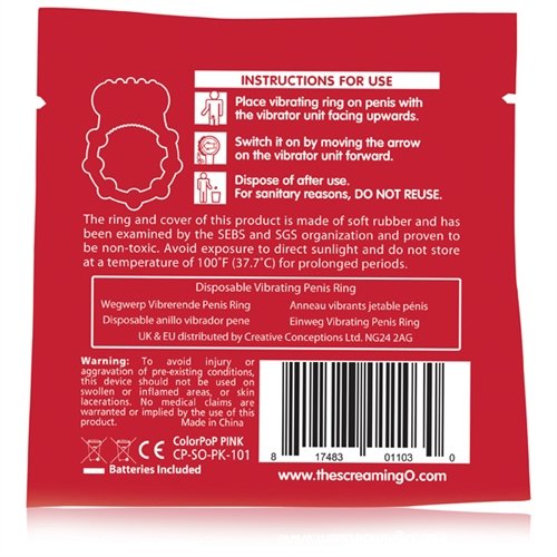 The Screaming O Vibrating Ring is the award-winning sex secret that helps couples have better more satisfying sex. With pleasure knobs for him and ticklers for her couples enjoy mutual stimulation with vibration that buzzes throughout the entire ring. Now available as a convenient ColorPoP Quickie couples can enjoy vibrant vibration at home or on the go with a disposable design they can take anywhere.