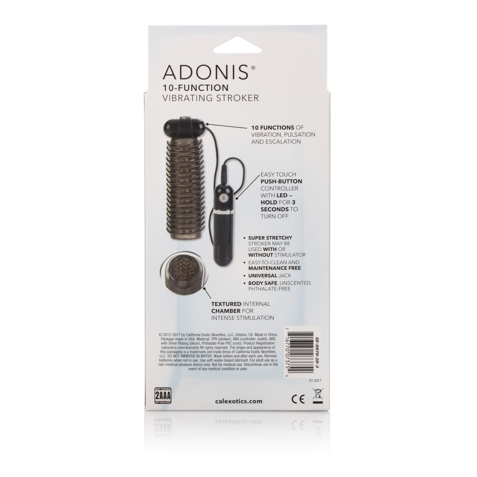 Soft tight and stretchy stroker with removable vibrating bullet. 10 functions of vibration pulsation and escalation. Push button controller with LED indicator and plug-in jack. Hold button for 3 seconds to turn off. Pleasure chamber with over 120 well placed ticklers. Ribbed exterior for a secure grip.