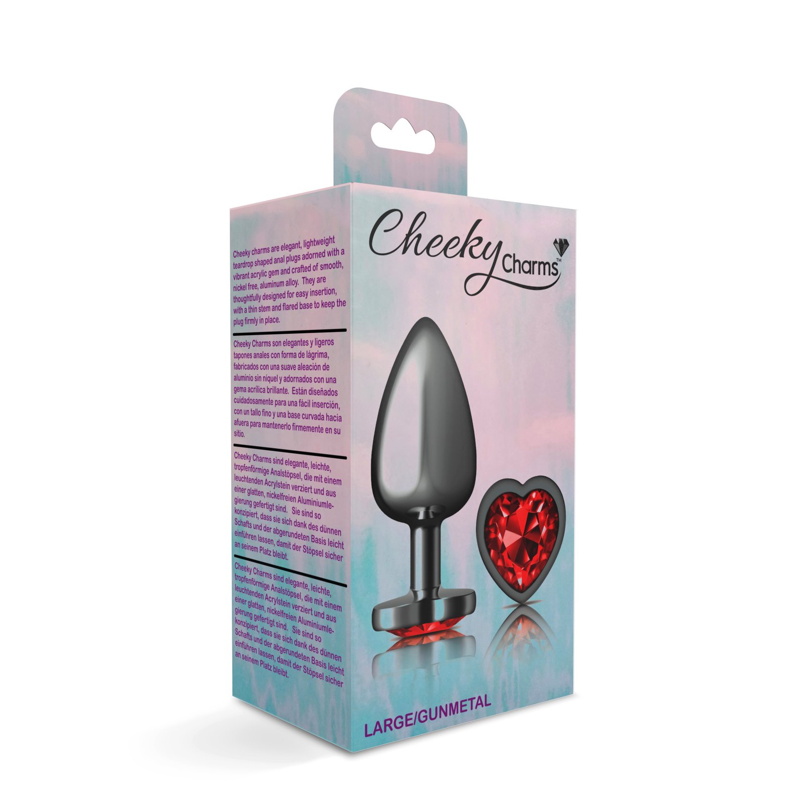 Large, gunmetal, teardrop shaped anal plug with sparkling deep red colored, heart shaped acrylic gemstone. Hypoallergenic, nonporous, body safe, nickel free, aluminum alloy, anal jewelry compatible with all lubricants. Easy to clean and dishwasher safe butt plugs.