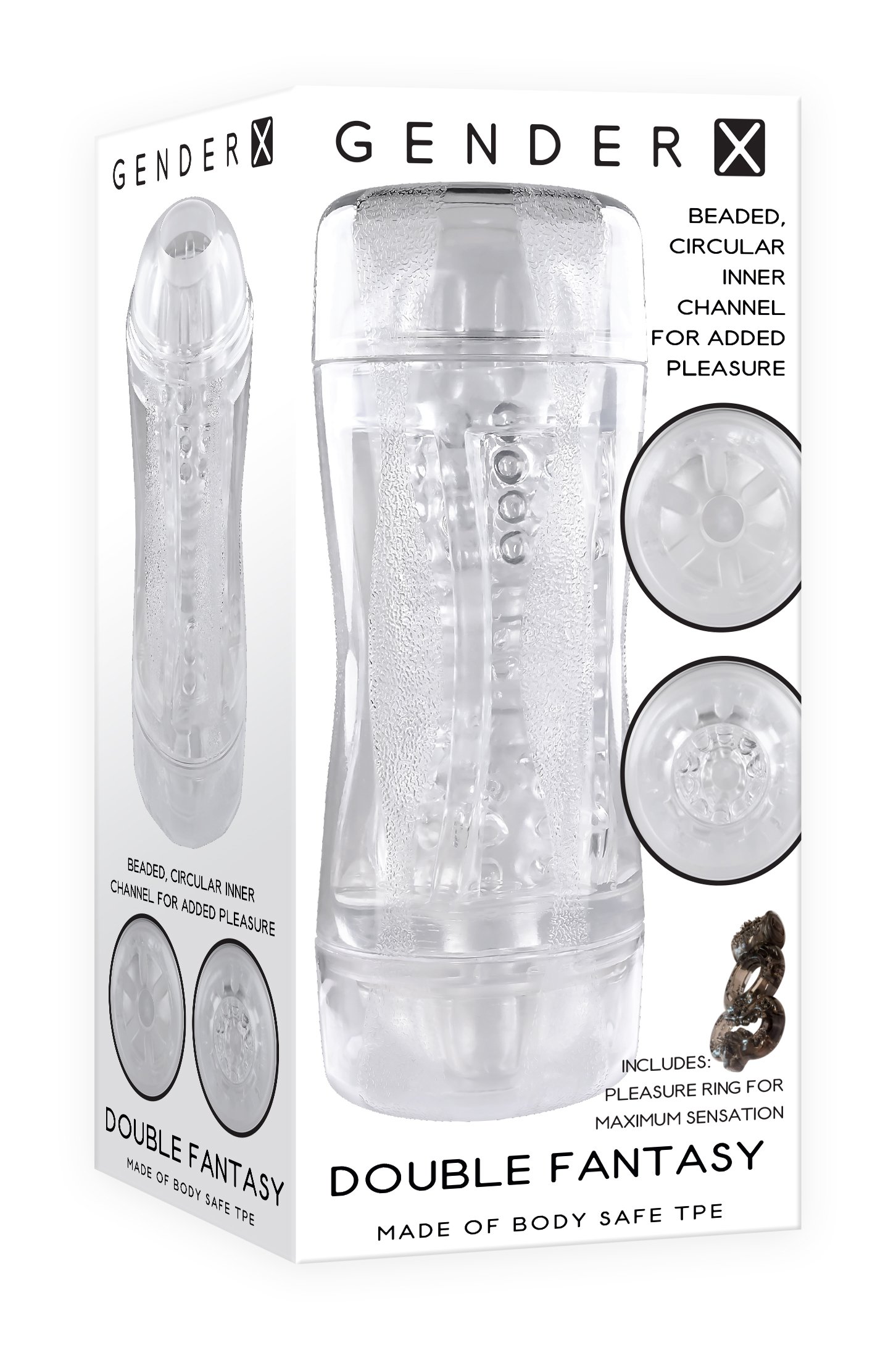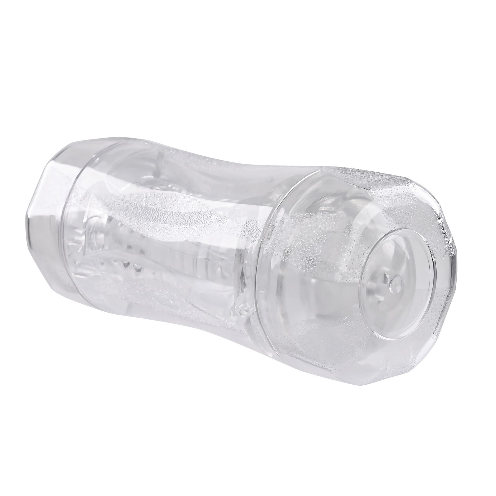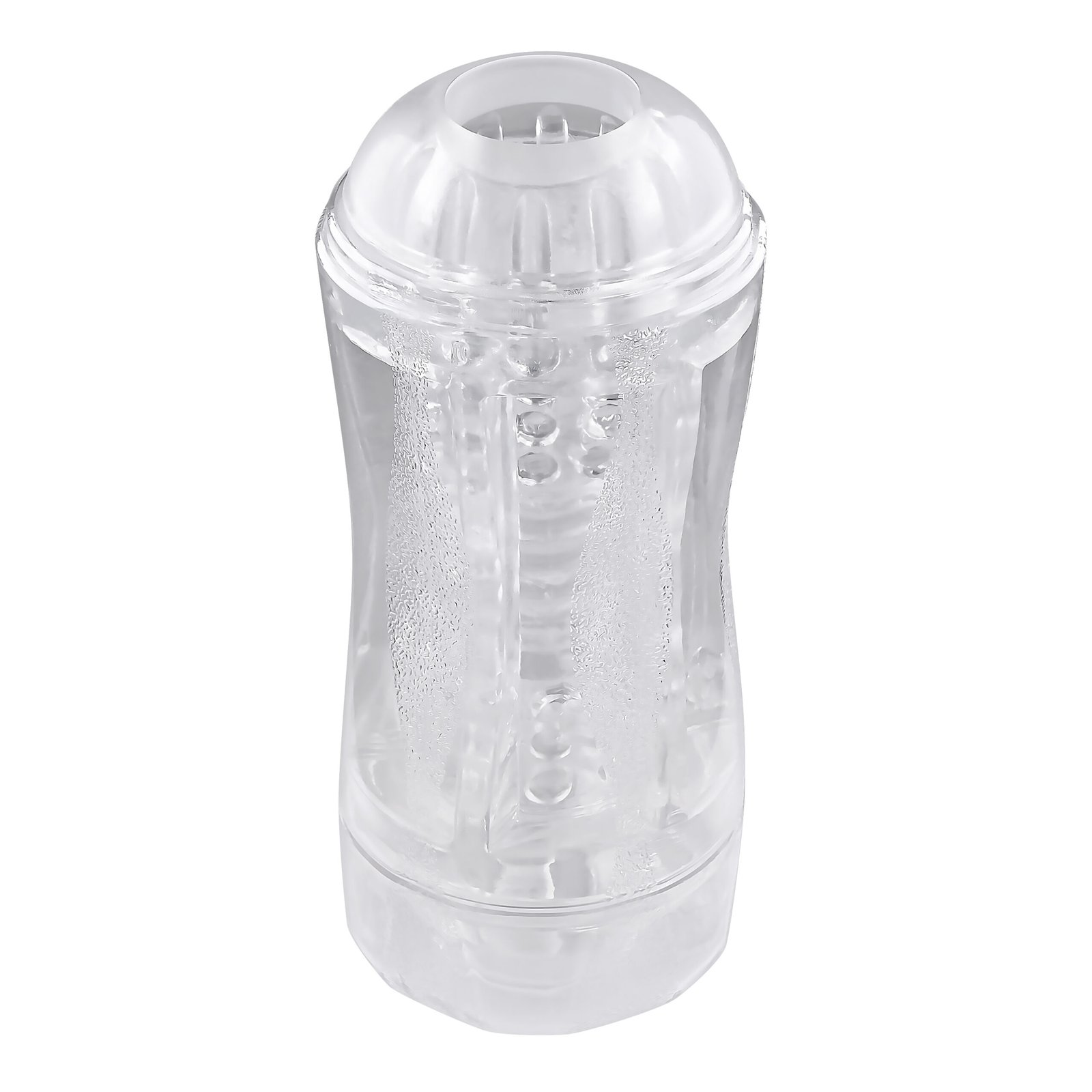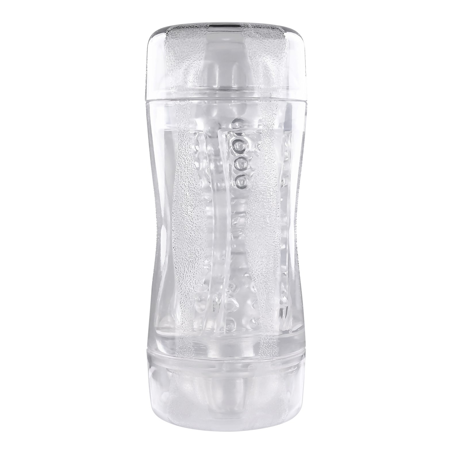 Allow the pleasure possibilities to unfold with this unique dual-ended stroker that’s beautifully transparent for an erotic see-through experience. Two separate entries with varying sizes (one tight, one loose) lets you choose your adventure inside the circular beaded chamber that’s soft and squishy, yielding yet firm. An included vibrating ring lets you experiment with intense stimulation while you play! The hard plastic exterior canister is textured for an easy grip while caps at both ends ensure safe storage and protection. Sleeve pops out for cleaning.