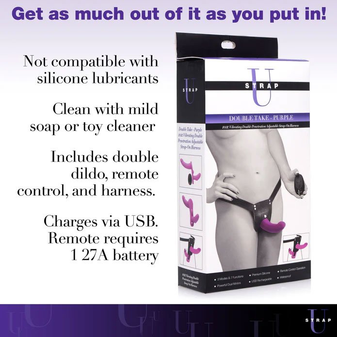 Note: Includes double dildo, remote control, and harness. Charges via USB. Remote requires 1 27A battery