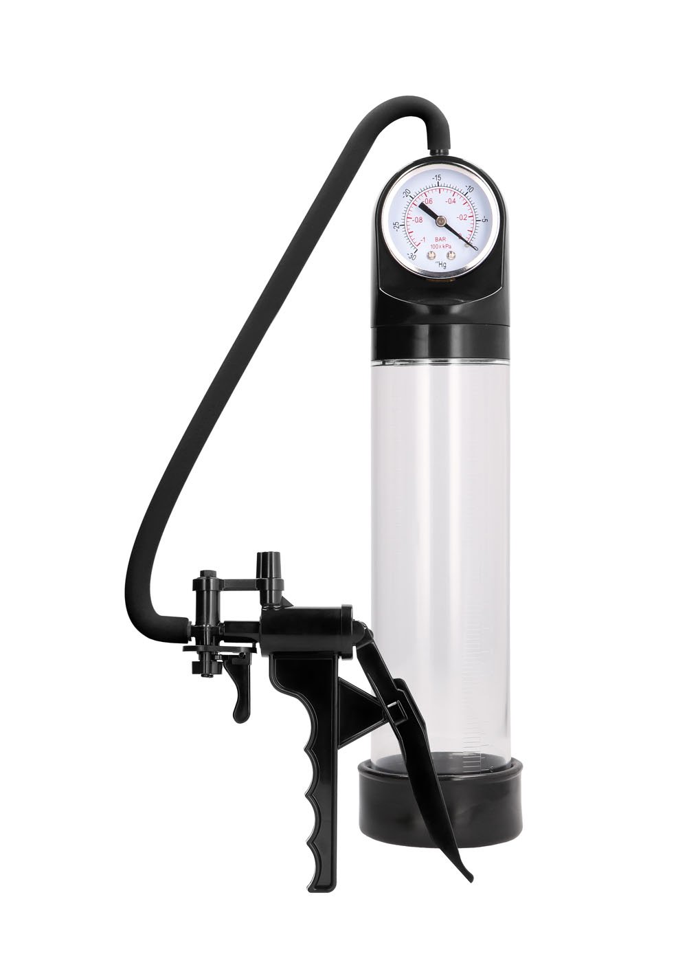 With a total cylinder length of 23cm (9″) and a diameter of 6cm (2.35″), this high-quality pump gives you ample possibilities to grow in both directions! The total length of the hose is 25cm (10″) and the insertion sleeve is made of smooth Silicone. Surprise yourself every time on how big you can get! There is a transparent version and there are another three different colours to choose from: blue, red or black. This variant comes with a comfortable handheld pump and a quick release valve for your comfort!