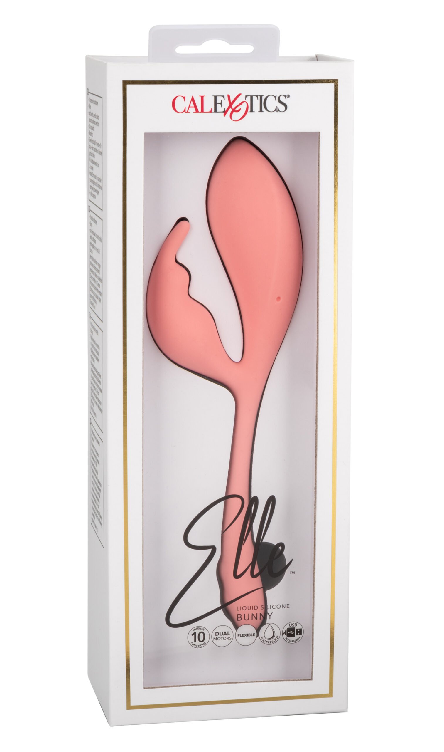 Indulge in waves of pleasure as the Elle Liquid Silicone Bunny moves you in all the right ways. The intimately contoured vibe is as thrilling as it is versatile with an extremely flexible body, flicking rabbit teaser, and 10 indulgent vibration functions. From steamy solo showers to hot times in the hot tub, get playful with the waterproof surface and powerful functions of vibration. The easy-touch 2-button control lets you cycle through the knee- shaking settings. While the easy touch buttons control the intensity and the vibe gives you the stimulation you want, the pliable body holds any position you desire. Recharge the premium silicone teaser in 2.5 hours with the provided USB charging cable to enjoy 35 minutes of high-speed stimulation or 90 minutes of low speed vibrations. The premium liquid Silicone is body safe, unscented and phthalate free that is softer, smoother, and more durable than traditional silicone.