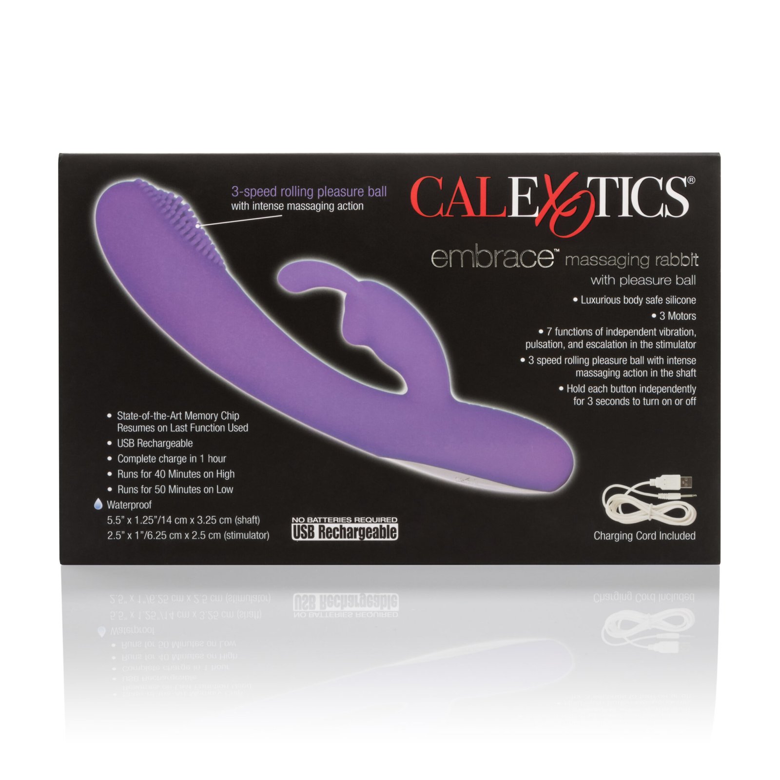 Powerful Silicone dual massager with triple motors. 7 functions of stimulator vibration, pulsation and escalation. A 3-speed rolling pleasure ball with intense massaging action on the textured tip. State-of-the-art memory chip resumes on last function used. USB rechargeable charging cord included. Full charge in 1 hour can run for 40 minutes on high speed and 50 minutes on low speed. Comes with an easy push button control, hold each button independently for 3 seconds to turn on or off.