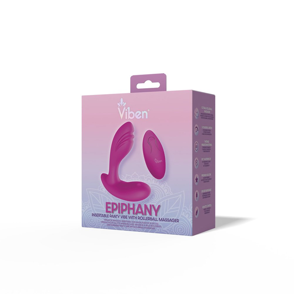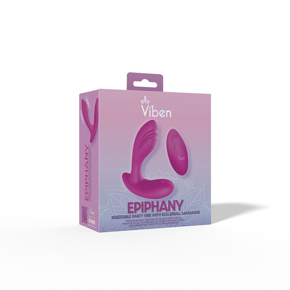 Inspire yourself with Epiphany, a remote-controlled, dual motor, rocker, panty-vibe that nestles in and against the body for mind-blowing stimulation. Epiphany features a unique clitoral massaging rollerball that swirls on and around the clitoris while its internal porton stimulates the G-Spot. Epiphany features a remote control, great for couples or solo play. Epiphany is USB rechargeable and waterproof in a vibrant pink Berry color.