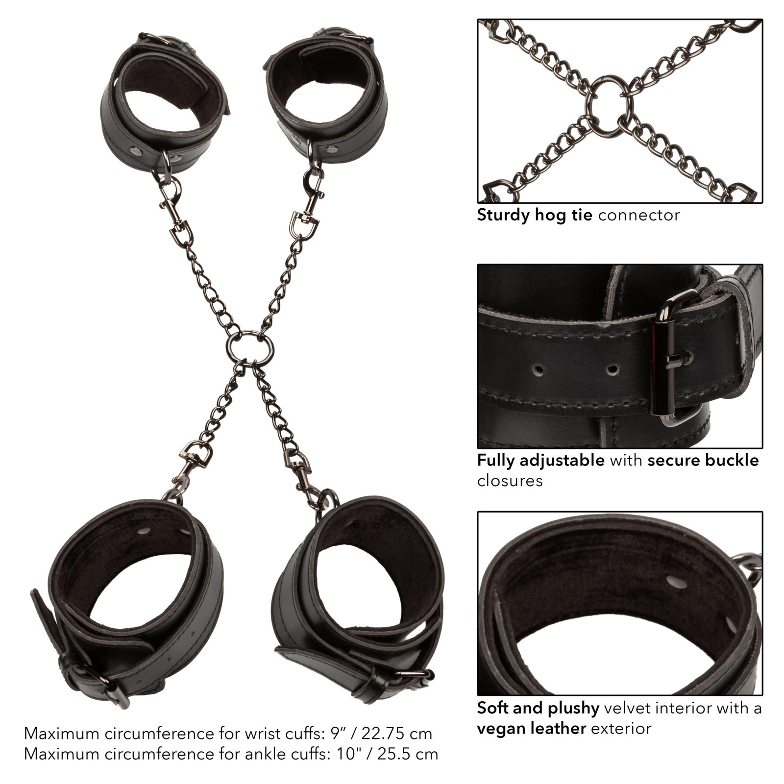 Sturdy hog tie connector and 4 fully adjustable cuffs with secure buckle closure