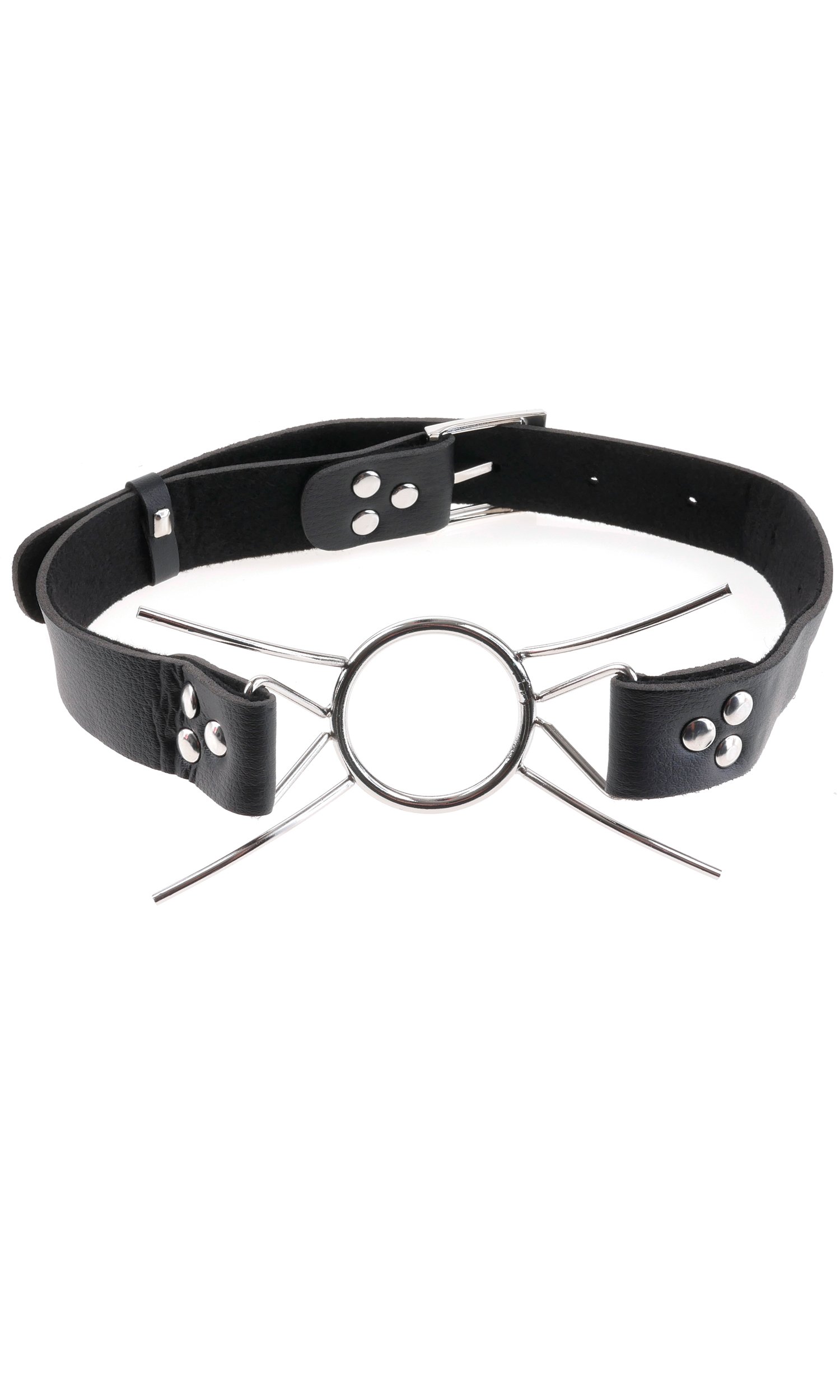 This extreme gag consists of a steel ring with four curved metal “legs” attached to the ring. The gag and legs prevent the mouth from closing, leaving your subject’s mouth wide open for whatever you wish to put in it.