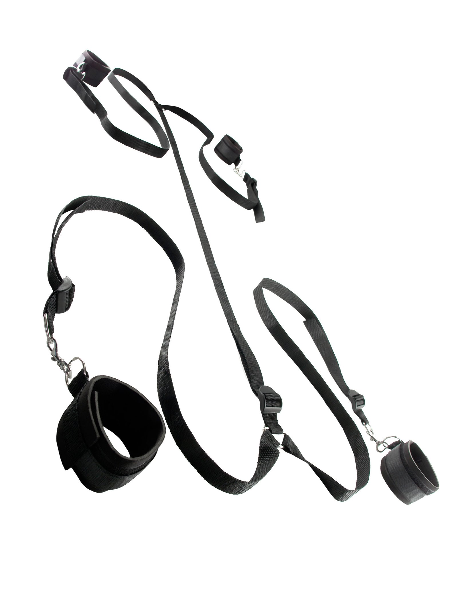 Transform your bed into a passion playground and let the games begin. These wraparound mattress restraints open a world of possibilities for you and your lover. Experience the thrill of bondage and take turns role-playing one minute youre in control the next youre at the mercy of your lover. The durable nylon tethers connect to 4 satin-lined cuffs which easily adjust to securely hold your partner in place. Explore your deepest fetish fantasies. Restraint System Includes 4 adjustable tethers 2 Velvet hand cuffs 2 velvet leg cuffs adjustable bed strap and love mask.