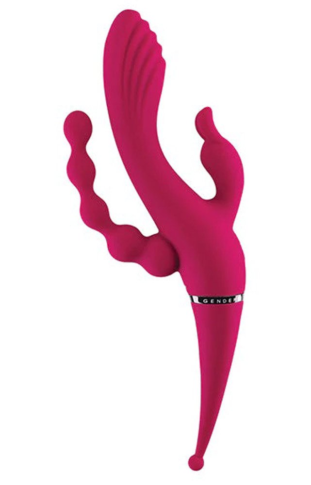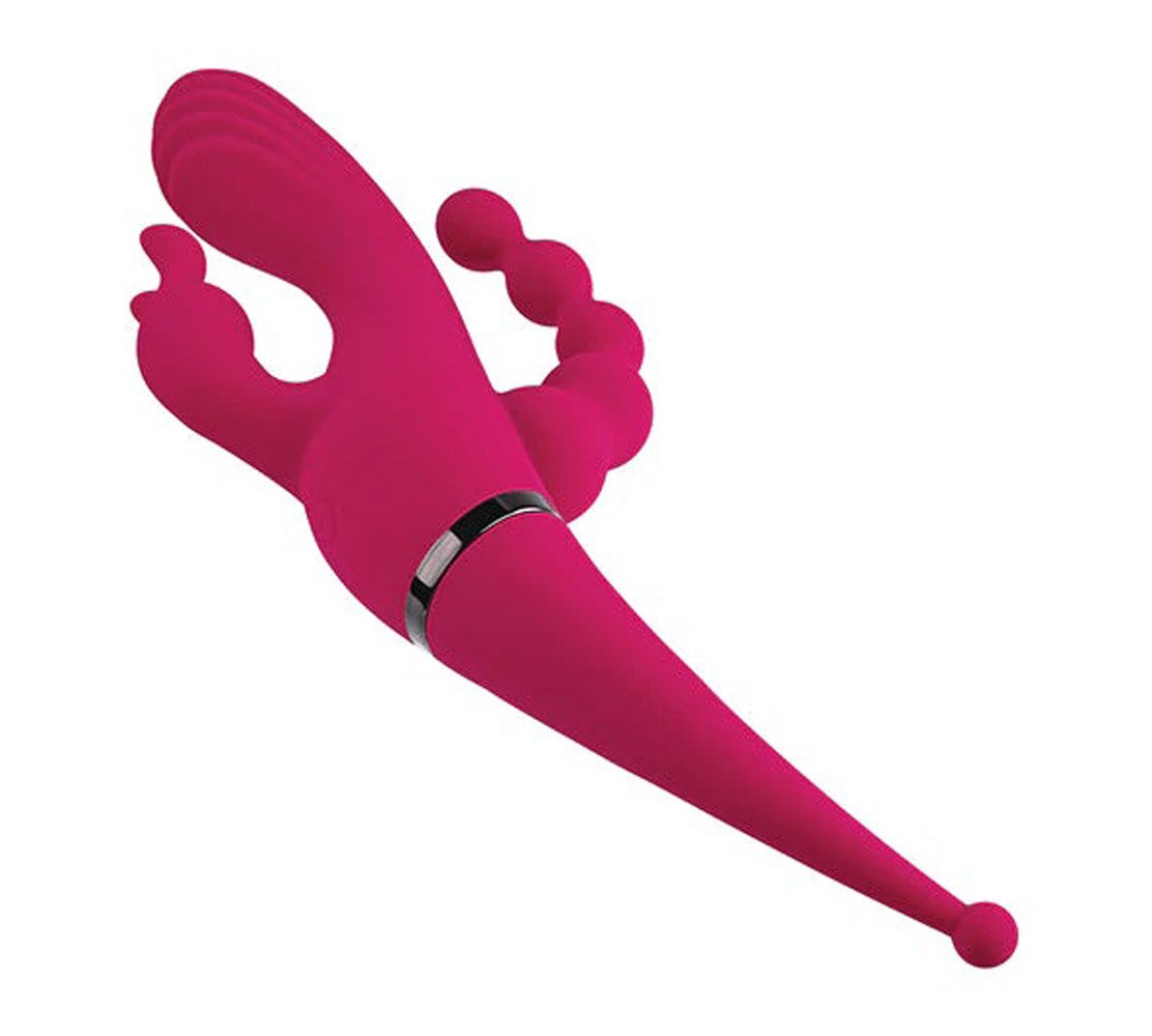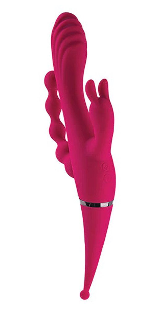 This remarkable vibrator has four points of stimulation in just under 10 inches! The center shaft features two playable ends a gently curved side with a bulbous textured tip, and a thin, pointy round ball end for targeted stimulation. Emerging from either side are two more stimulators a hard-working rabbit with buzzing ears and a chunky head, and a thin, curved beaded shaft that flexes easily to move with your body. A 2-button control panel engages 3 motors at once, with a separate button for the round-tip pointer. Find out what fantasies this quadruple-stimulation toy can bring to life with its abundant possibilities! Completely rechargeable, water submersible and easy to clean.