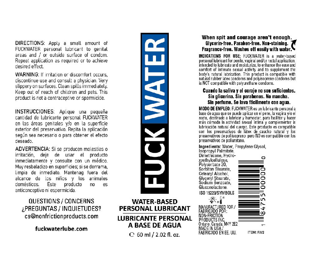 Made of only premium ingredients Fuck Water is the perfect wingman. Whether you are going out on the town or staying in alone you are never flying solo with Fuck Water at your side. Because its glycerin-free it never dries sticky. Its long lasting cleans up easily with water and delivers the perfect amount of lubrication every time. Its also paraben-free and made with the safest or someone to lend you a hand Fuck Water is the only wingman you need. Fuck Water is a water-based lube that contains the silicone ingredient dimethicone. It is latex-friendly but may react with some silicone toys. Before using Fuck Water with your favorite silicone toy please do a spot test on the bottom or base of the toy.