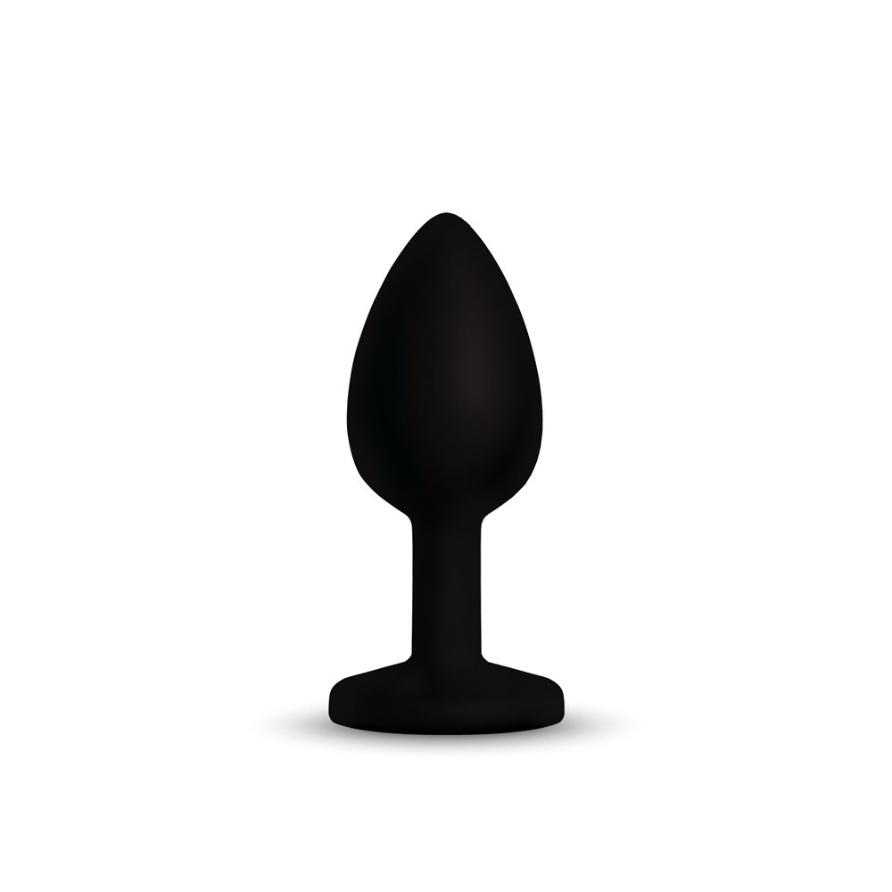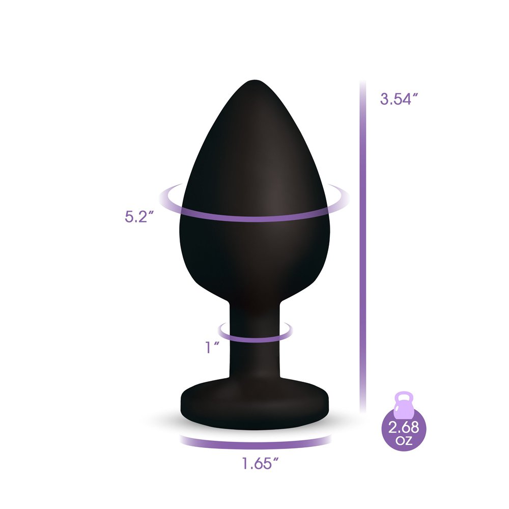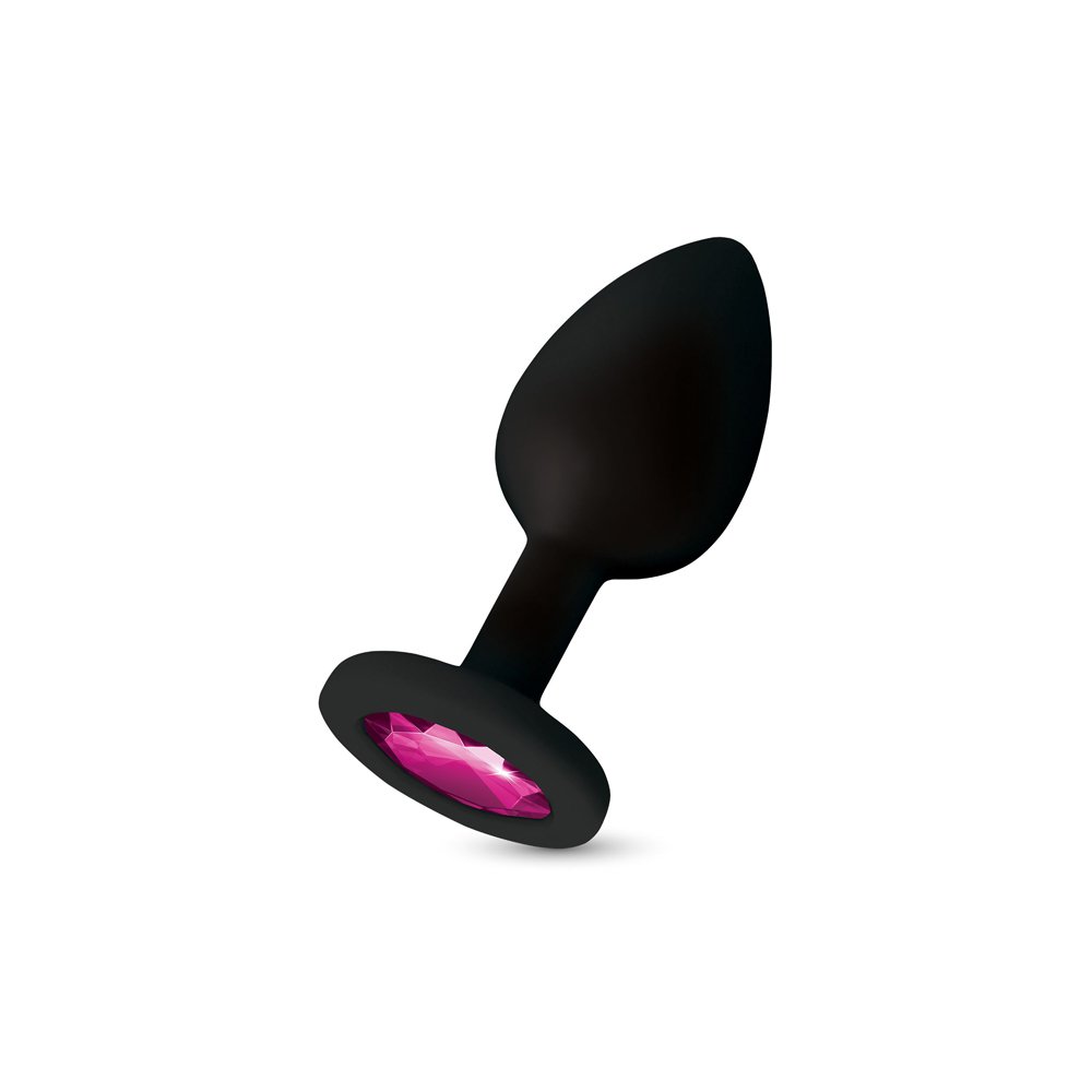 Large, Black silicone, teardrop shaped anal plug with sparkling Bright Pink colored, round acrylic gemstone. Body safe, premium silicone, anal jewelry. Easy to clean and dishwasher safe butt plugs. Available in various colors and sizes.