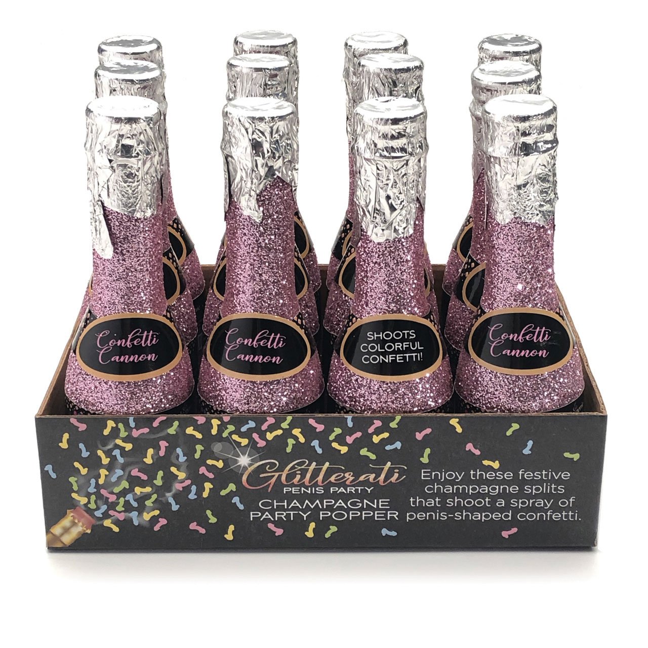 Designed for the bridal party with impeccable taste, style and class. Each display of 12 mini champagne bottle poppers are filled with colorful penis shaped confetti elevating your next Bachelorette or Anniversary party to VIP status. On-trend for this wedding season our Glitterati line of party goods are playful yet refined and sophisticated. Make sure you complete the look with coordinating Glitterati balloons, plates, napkins and more! Celebrate your next big event with these Super Fun Party Supplies!