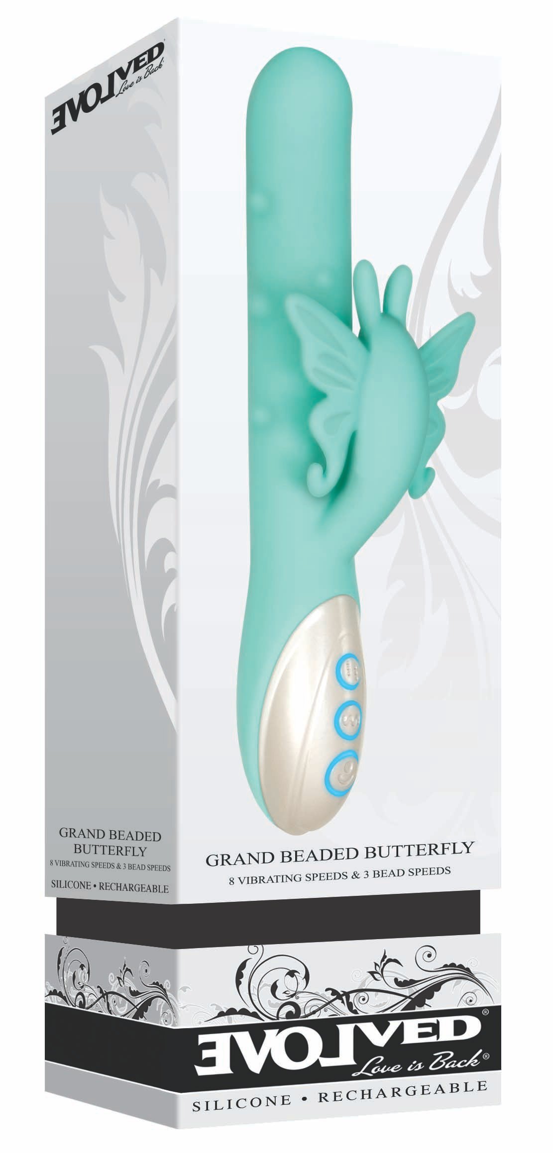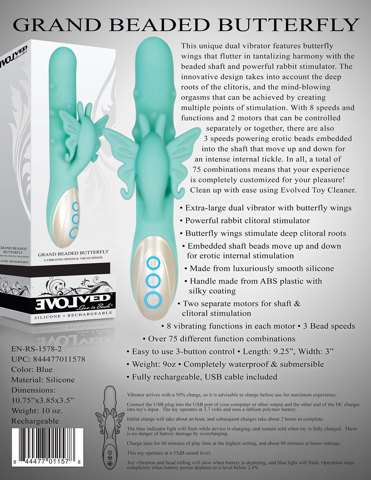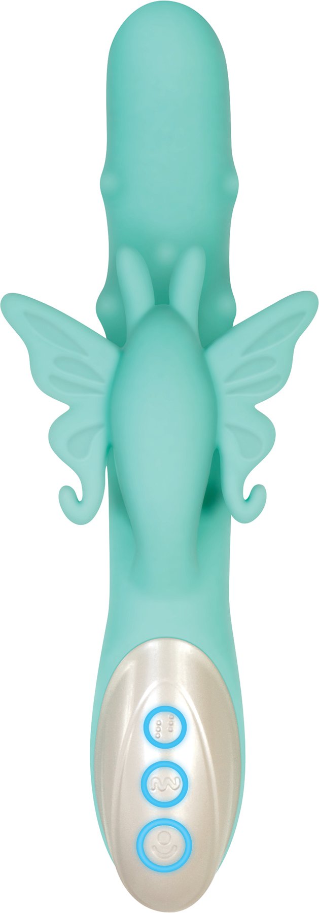 This unique dual vibrator features butterfly wings that flutter in tantalizing harmony with the beaded shaft and powerful rabbit stimulator.