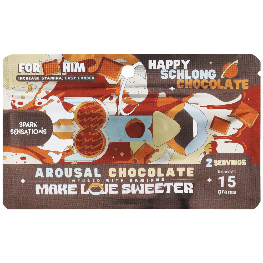 Happy Schlong Chocolate is a high-quality liquid arousal chocolate, made in the USA. The sweet beginning to your happy ending. Prepare for a delicious mind- blowing sexual experience. Infused with dark cocoa, rich in theobromine and phenylethylamine to naturally enhance desire and pleasure. Features powerful botanicals like Damiana, Kava, Horny Goat Weed, Yohimbe, Maca, and more. Boost libido, improves mood, and intensifies physical response for a more connected experience. Take half a tube 2-4 hours before intimacy; activates with stimulation. Effects kick in during stimulation, ensuring a natural and responsive experience.