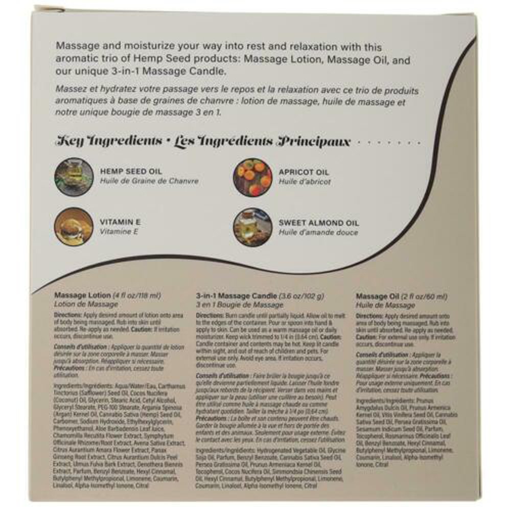 Massage and moisturize your way into rest and relaxation with this aromatic trio of Hemp Seed products: Massage Lotion, Massage Oil, and a unique 3-in-1 Massage Candle.