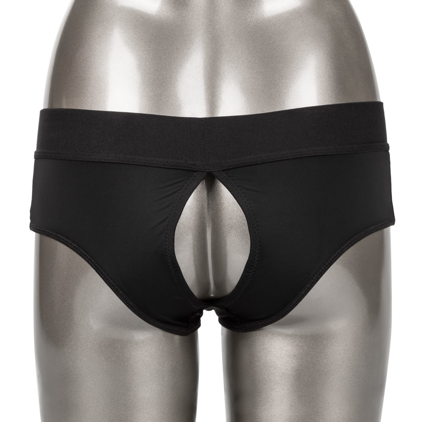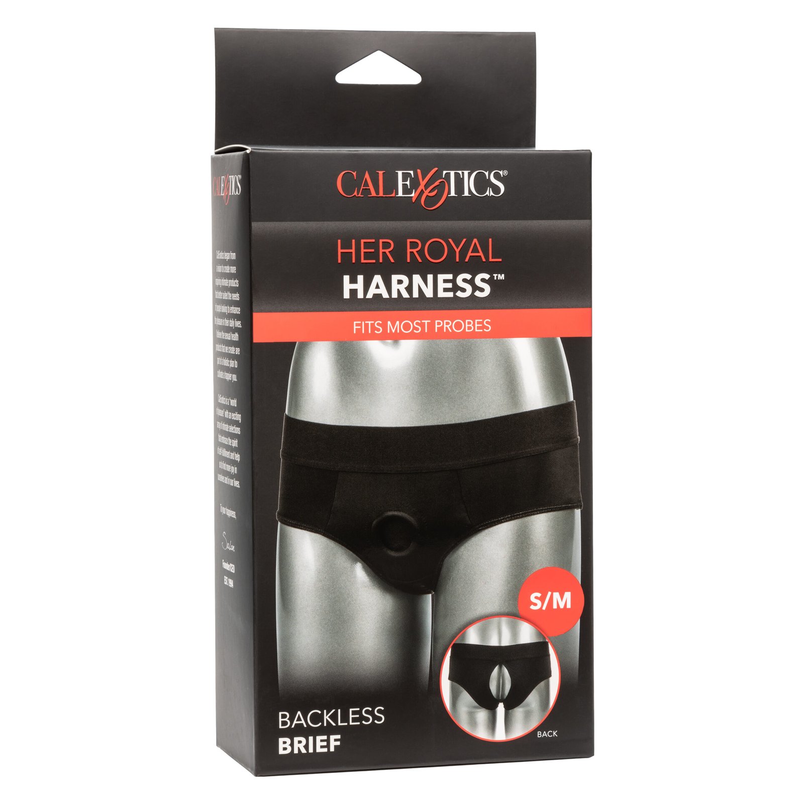 The Her Royal Harness Backless Brief is an ultra-comfortable harness fashioned like a risqu backless brief with powerful performance and comfort in mind. This bold harness has an extra-wide waistband, soft stretchy fabric and reinforced O ring for the ultimate support. The durable, reinforced O-ring stretches to accommodate your favorite probe, packer, vibrator or dildo. With a form-fitting design, this comfort harness can be worn discreetly under clothes. Enjoy pleasure made for two with the double panel interior for easy access to your favorite probe. Beginners and expert users alike will love frustration free pleasure with this easy-to-wear harness. Simply secure your favorite probe slip into the bold backless brief and dive deep into passionate penetration or enjoy comfortable all-day wear.