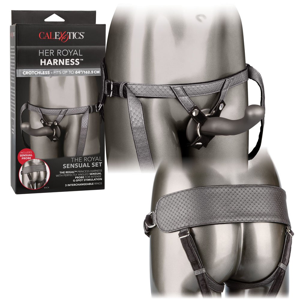 Made to thrust you into the thrilling world of a deeply satisfying pleasure with the Her Royal Harness The Royal Sensual Set. Each set includes the Regal Princess and the Sensual Probe with 3 interchangeable probe rings.