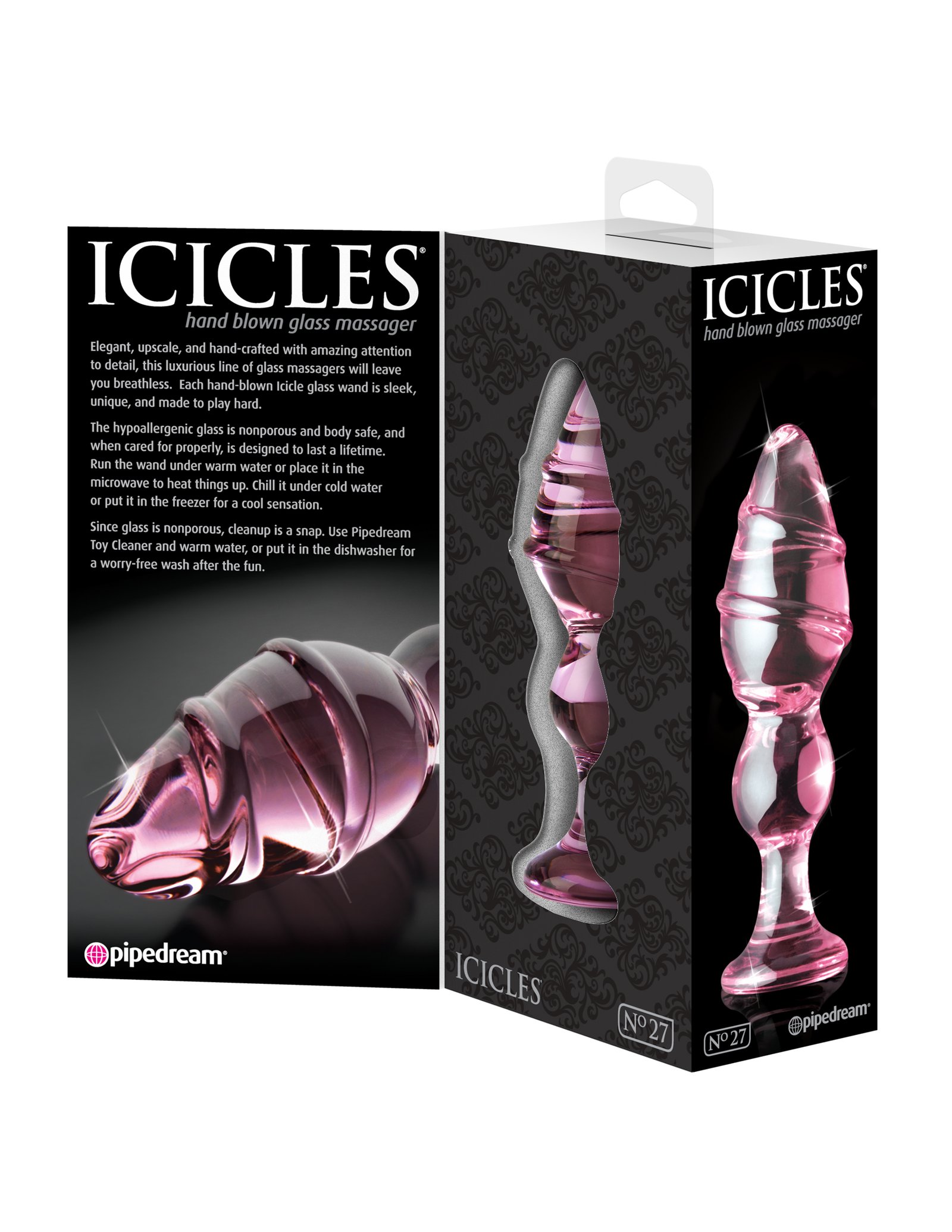Elegant upscale and hand-crafted with amazing attention to detail this luxurious line of glass massagers will leave you breathless. Each hand-blown Icicle glass is sleek and unique and made to play hard. The hypoallergenice glass is nonporous and body safe and when cared properly is designed to last a lifetime. Run the wand under warm water or place it in the microwave to heat things up. Chill it under cold water or put it in the freezer for a cool sensation.
