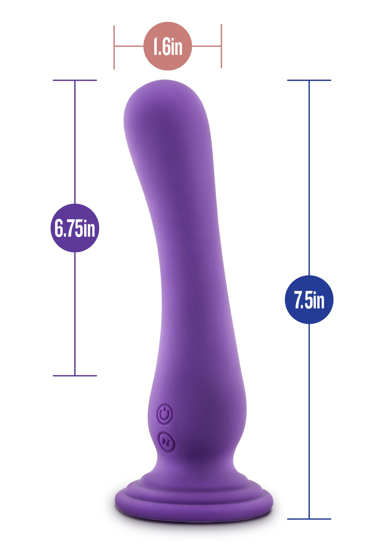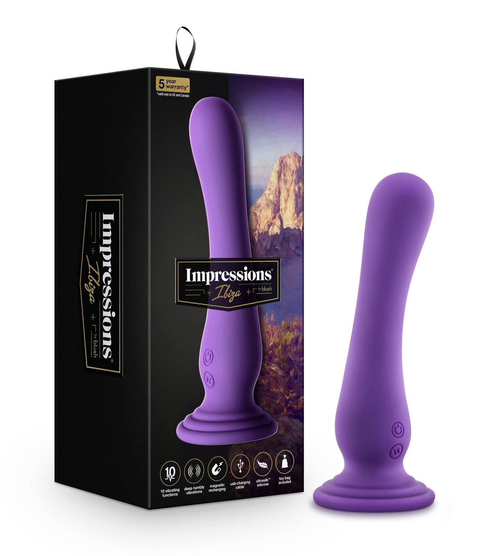The Impressions Ibiza is ready to keep the party going all night long! Ibiza is beautifully curved for optimal G Spot or prostate play. With deep, rumbly vibrations that cycle through 5 levels and 5 variations of pulsation and escalation using the powerful Rumble Tech motor, Ibiza is ready to take you on the ultimate adventure. The flared base makes it harness compatible and safe for anal play. The powerful suction cup allows you to play hands free; just stick it to any smooth, flat surface. Ibiza has Magna Charge USB magnetic recharging to ensure it remains waterproof for the lifetime of the product and IPX7 waterproof for easy cleaning. Ultrasilk smooth and made with Puria silicone, its body-safe, and phthalate free. With Impressions, the possibilities are endless, so pack up and get ready to go to Ibiza!
