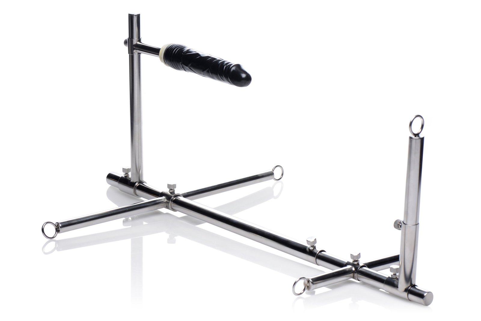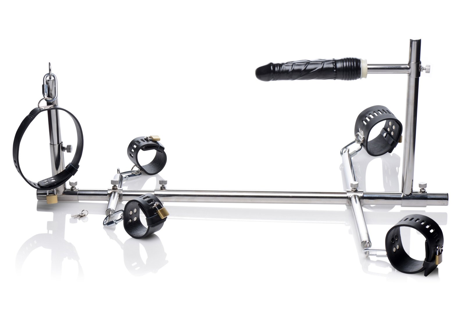 Measurements: Base bar adjusts from 26 to 47 inches. Wrist bar is 10.5 inches across. Ankle bar is 20.5 inches across. Height of dildo adjusts from 1.5 inches from base to 11.5 inches from base. Dildos protrudes 11 inches from bar. Insertable portion measures 7.5 inches in length, 1.75 inches in diameter. Collar adjusts from 13 to 18.5 inches in circumference. Wrist restraints adjust from 6 to 8.5 inches in circumference. Ankle restraints adjust from 6 to 11.5 inches in circumference.