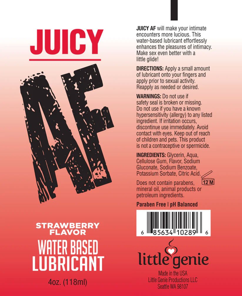 JUICY AF will make your intimate encounters more luscious. This water-based lubricant effortlessly enhances the pleasures of intimacy. Whether you like to play alone or with friends, AF Juicy Lubricants provide that wet and juicy feel for sheer satisfaction. Relish in the pure ecstasy of sexual play, reduce discomfort with this long-lasting lube that washes off clean with water. Make sex more delicious with Juicy AF lubricant.