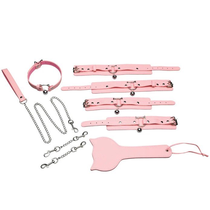Complete Kit: Included is a collar and chain leash with vegan leather handle, wrists and ankle cuffs, two chain connectors with clips, and a kitty-head paddle.