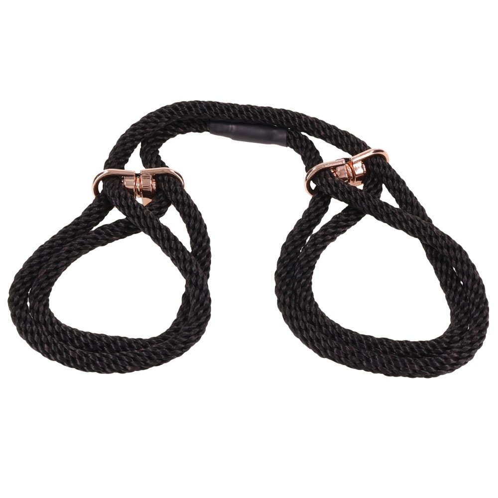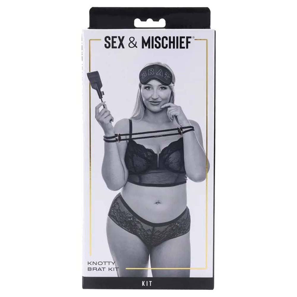Captivating newly improved rope cuffs for the knottiest of submissives. Teach your bratty bottom how to properly submit with the perfectly curated Brat Kit! Keep them restrained with the included rope handcuffs in a stunning black with rose gold metal accents while you tap and tease every inch of their body with the accompanying mini crop. Punish them by taking away their sight with the included satin blindfold emblazoned with BRAT, and inflict them with your every naughty desire they deserve.