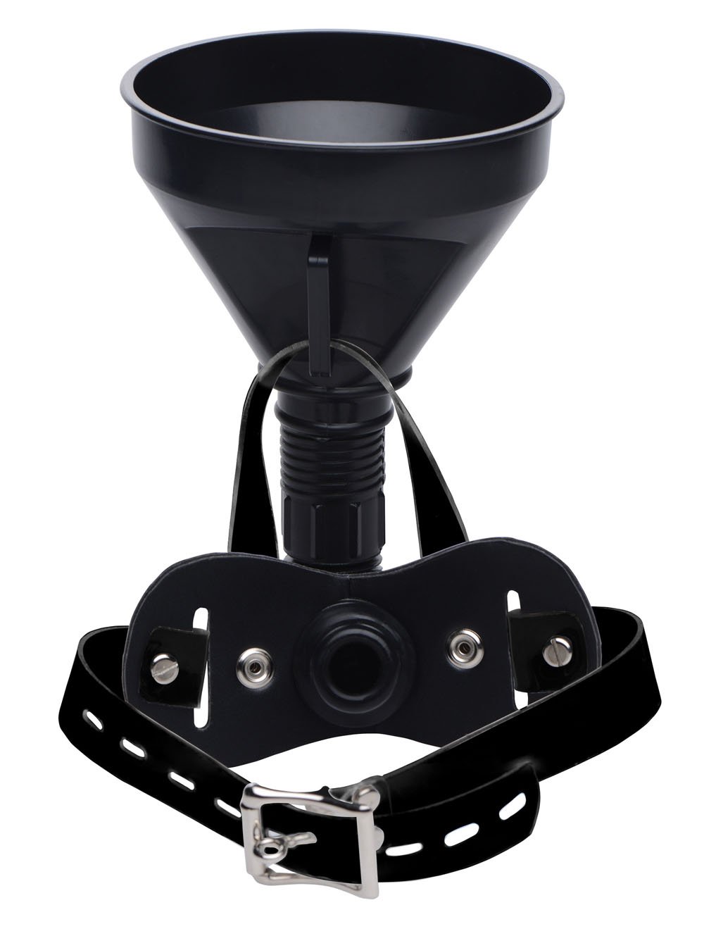 The name says it all! Pour the liquid of your choice down your slaves throat, forcing them to swallow every drop! This innovative and unusual gag adjusts around your submissive lovers head, tightening and even locking so that they cannot escape your twisted desires. The flexible funnel is held upright by a strap that snaps in place, but can be removed so you have more control. The funnel that emerges from the gag allows you to fill your plaything up with whatever you want! Take things up a notch with this sick and sadistic device! measurements:head strap adjusts from 16. 5 to 22 inches. Gag portion is 1. 85 inches insertable, 1 inch in diameter.