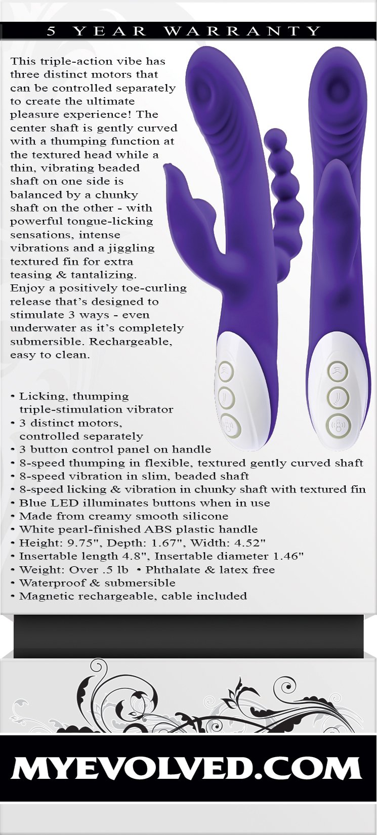 This triple-action vibe has three distinct motors that can be controlled separately to create the ultimate pleasure experience! The center shaft is gently curved with a thumping function at the textured head while a thin, vibrating beaded shaft on one side is balanced by a chunky shaft on the other – with a powerful tongue-licking sensations, intense vibrations and a jiggling textured fin for extra teasing & tantalizing. Enjoy a positively toe-curling release that’s designed to stimulate 3 ways – even under water as it’s completely submersible. Rechargeable, easy to clean.
