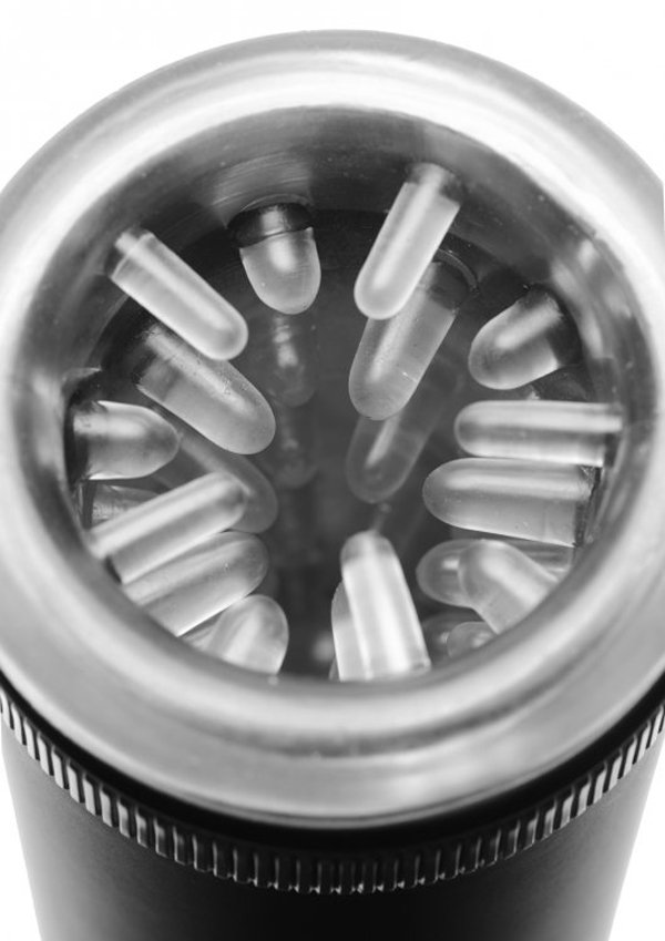The Master-Bot is a super powered masturbator that does the hard work for you. Enjoy ultimate masturbation sessions with the push of a button or add to the experience with your own stroking action. Within the hollow chamber is a soft TPR sleeve that wraps around your rod and heightens the experience with rows of strategically placed ticklers that will massage your rod as you stroke. With the simple two speed controller switch, and the exhilarating textured interior you are assured an explosive finish with the height of stroker technology. Simply lube up slide in and let Master-Bot do all the work.