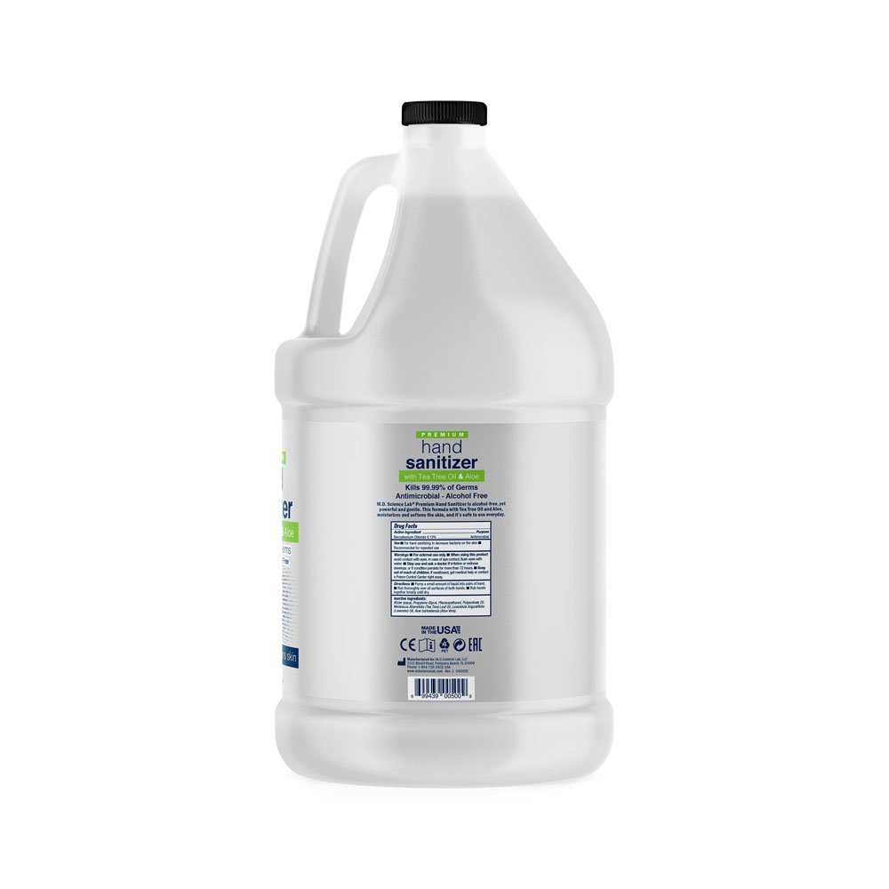 M.D. Science Lab Premium Hand Sanitizer is alcohol-free, yet powerful and gentle. This formula with Tea Tree Oil and Aloe moisturizes and softens the skin, and its safe to use every day.