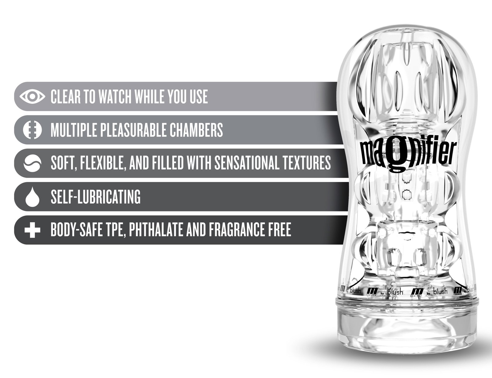 The M for Men Magnifier is loaded with fun! This pocket stroker is clear, allowing you to watch as you use! Magnifier is also Self-Lubricating. Add a little water or saliva and everything gets slippery, just like the real thing! There are multiple chambers and unique textures inside that assist with a powerful suction feel. These multiple chambers create an unparalleled feeling and enhanced pleasure no matter where you decide to play. M for Men masturbators are soft, flexible, and filled with sensational textures. Made of premium TPE, Magnifier is fragrance free, and phthalate free and is squeezable. As with all products and/or materials at Blush it has been 3rd party lab tested to meet or exceed REACH and Prop65 safety compliance directives. It’s your body. Be mindful of what you put in it.