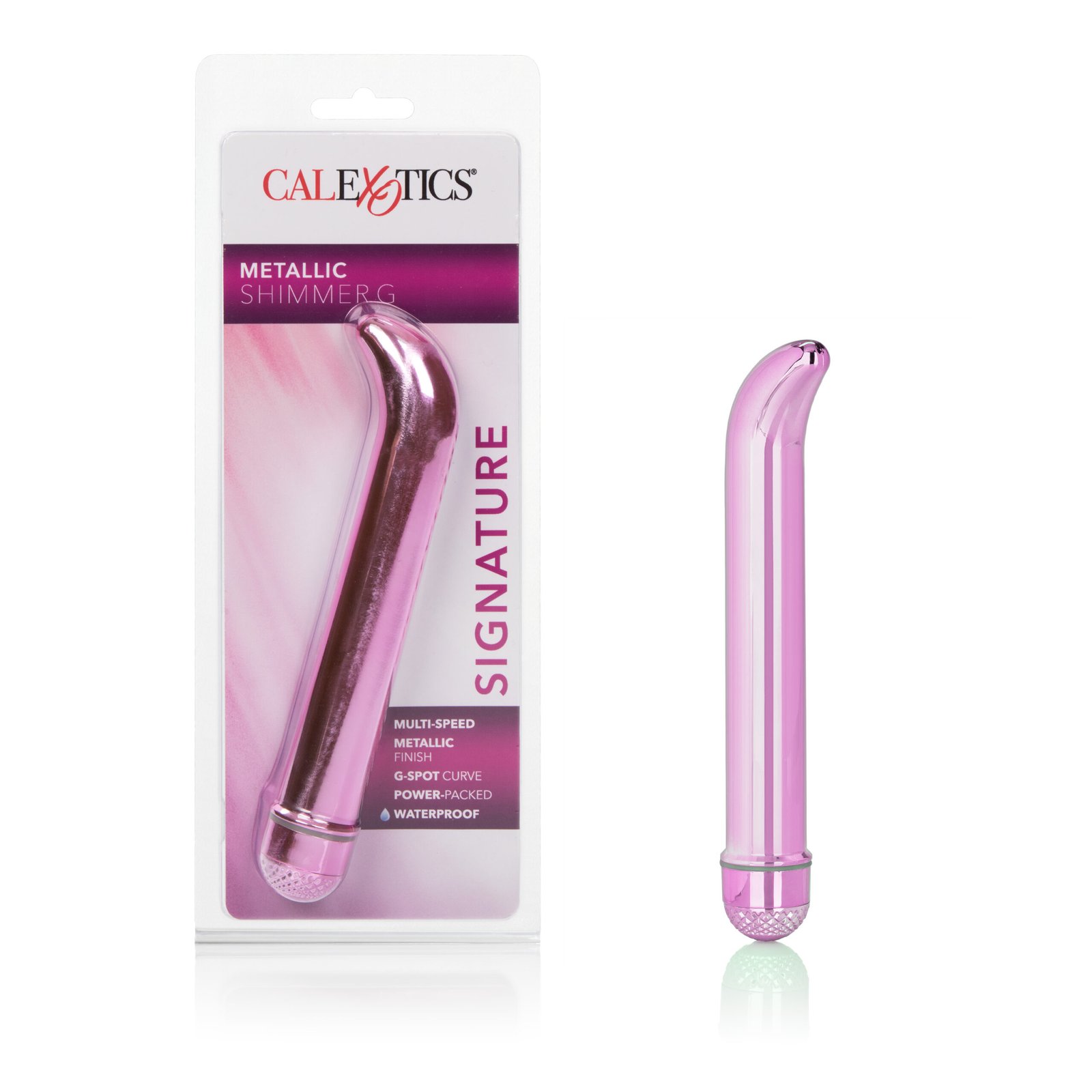 The power-packed Metallic Shimmer G is a multi-speed vibrator with a G-Spot curve for the best stimulation! Smooth and seamless with a metallic finish. May be used in or out of the water for fun in the bath or shower.