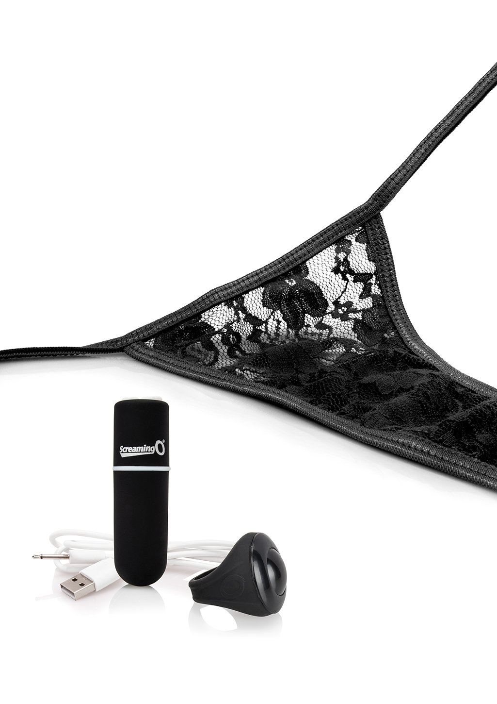Rechargeable vibrating panty set with remote control ring. Lace side-tie panties in a one size fits most size features a secret pocket to keep your vibe right where you want it! (Fits up to 60″ waist). Vooom rechargeable bullet with 10 functions that wirelessly sync with remote-control ring or works on its own. The remote is disguised as a ring! Discreet push-button remote looks like an ordinary finger ring and works up to 50 feet away! Made of stretchy silicone to fit almost any size finger.